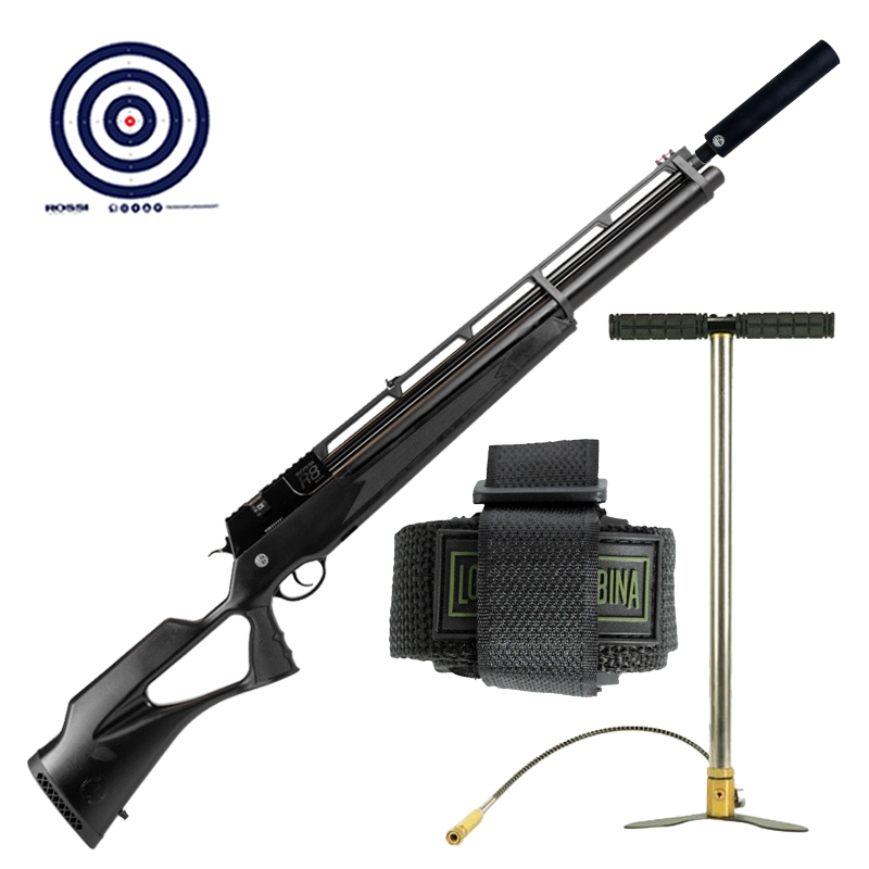 PCP ROSSI R8 BLACK CARABINA DE PRESSÃO 5.5MM 8 TIROS + BOMBA PCP + BANDOLEIRA + SUPRESSOR R8 + ALVOS