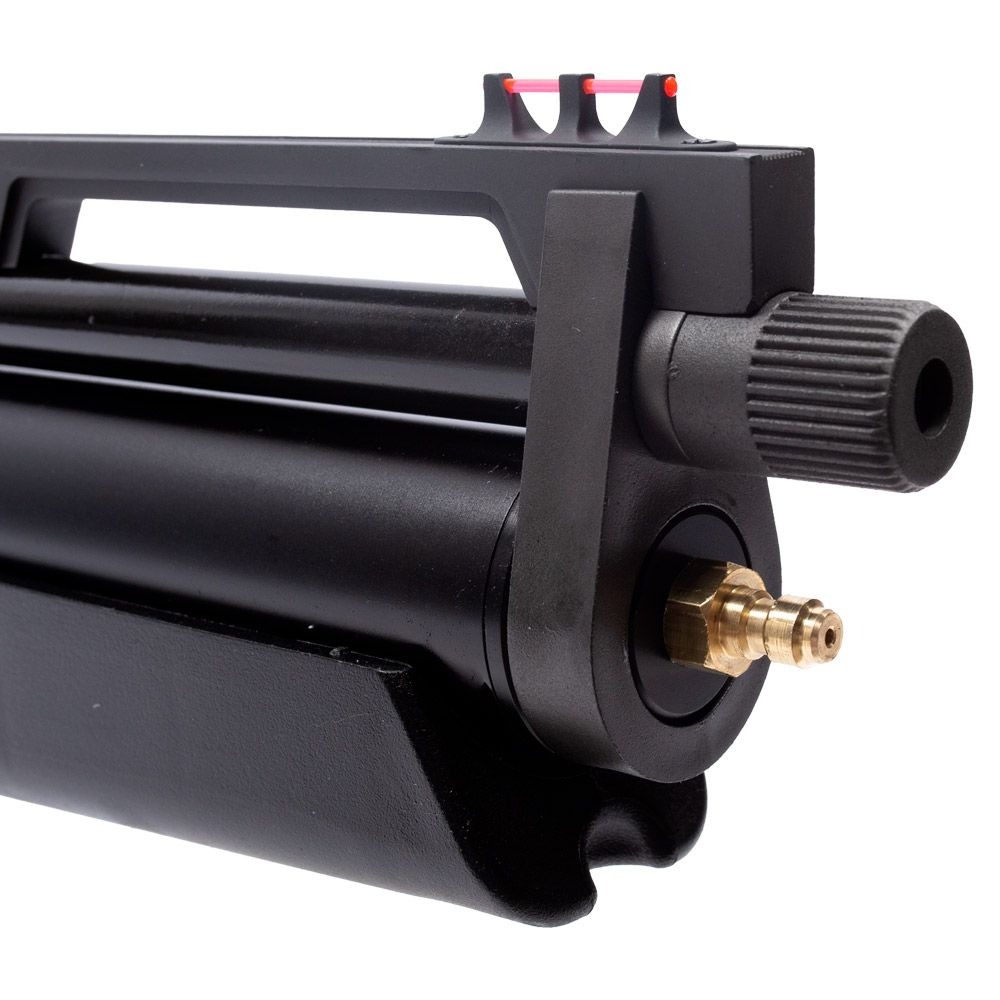 Equipada com um cilindro reforçado de 270 cc e pressão máxima de 275 BAR, oferece autonomia de aproximadamente 80 disparos em ação dupla e 40 disparos em ação simples, garantindo longas sessões de tiro com excelente constância. Seu sistema sem regulador proporciona o alto fluxo de ar direto, gerando disparos mais intensos, velozes e potentes, especialmente entre 240 BAR e 200 BAR, onde a carabina atinge o seu ponto doce de performance máxima.