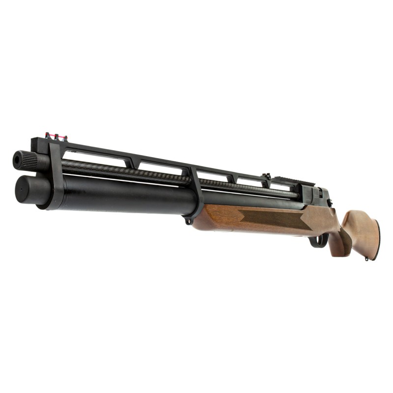 O cano é raiado dando alta precisão e velocidade no disparo. O cano é revestido com fibra de carbon.