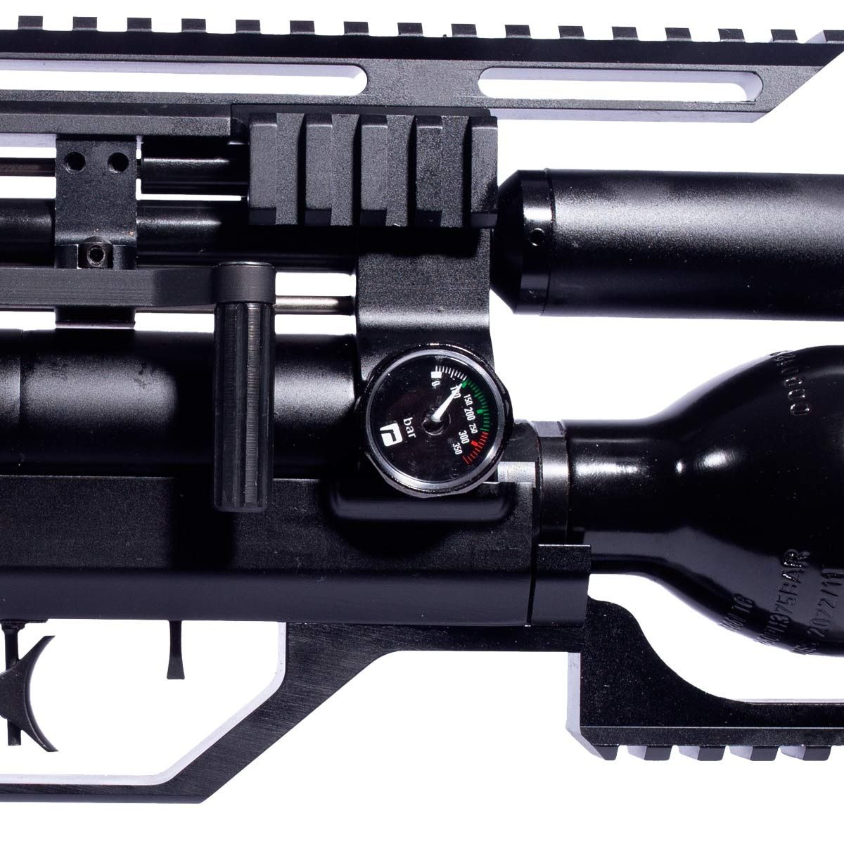 Equipada com cilindro frontal em fibra de carbono com capacidade de 425 cc, além de uma pré-câmara de 90 cc, totalizando capacidade total de ar de 515 cc.