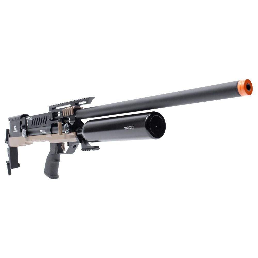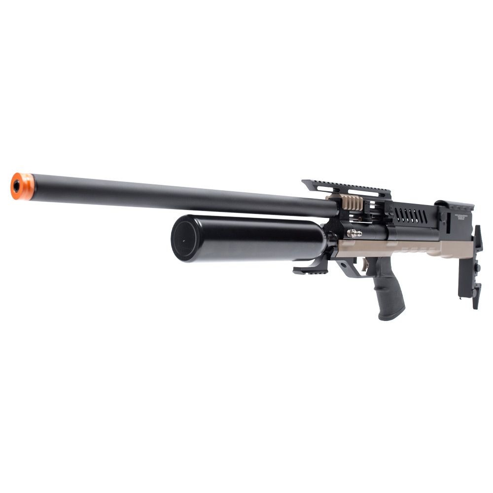 Equipada com cilindro dianteiro em fibra de carbono de 425 cc aliado a uma pré-câmara de 90 cc (total de 515 cc), opera com pressão máxima de 250 bar e proporciona autonomia aproximada de até 150 disparos. Conta com válvula reguladora, ajuste externo de martelo e dois manômetros independentes para monitoramento completo do sistema. Seu gatilho ajustável de 4 estágios, engatilhamento lateral side lever e sistema multishot com dois magazines de 12 chumbinhos garantem controle e praticidade durante o uso.