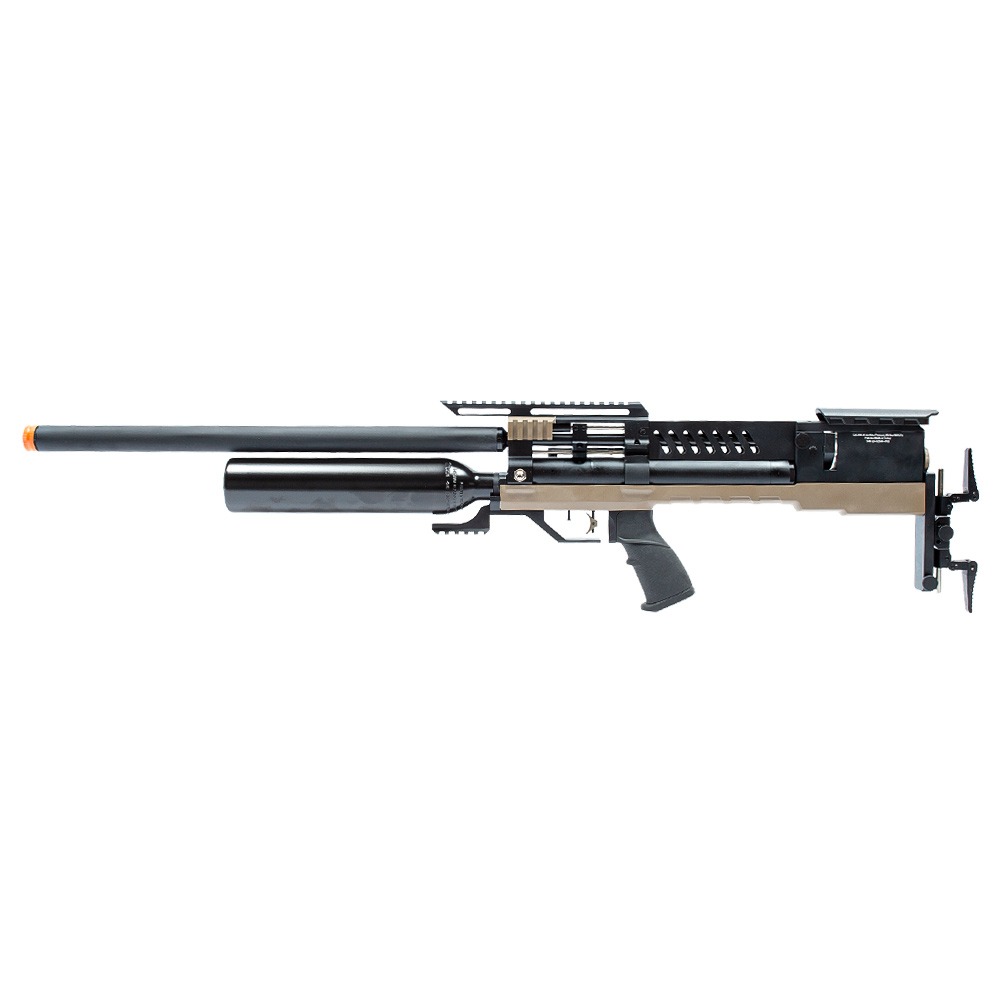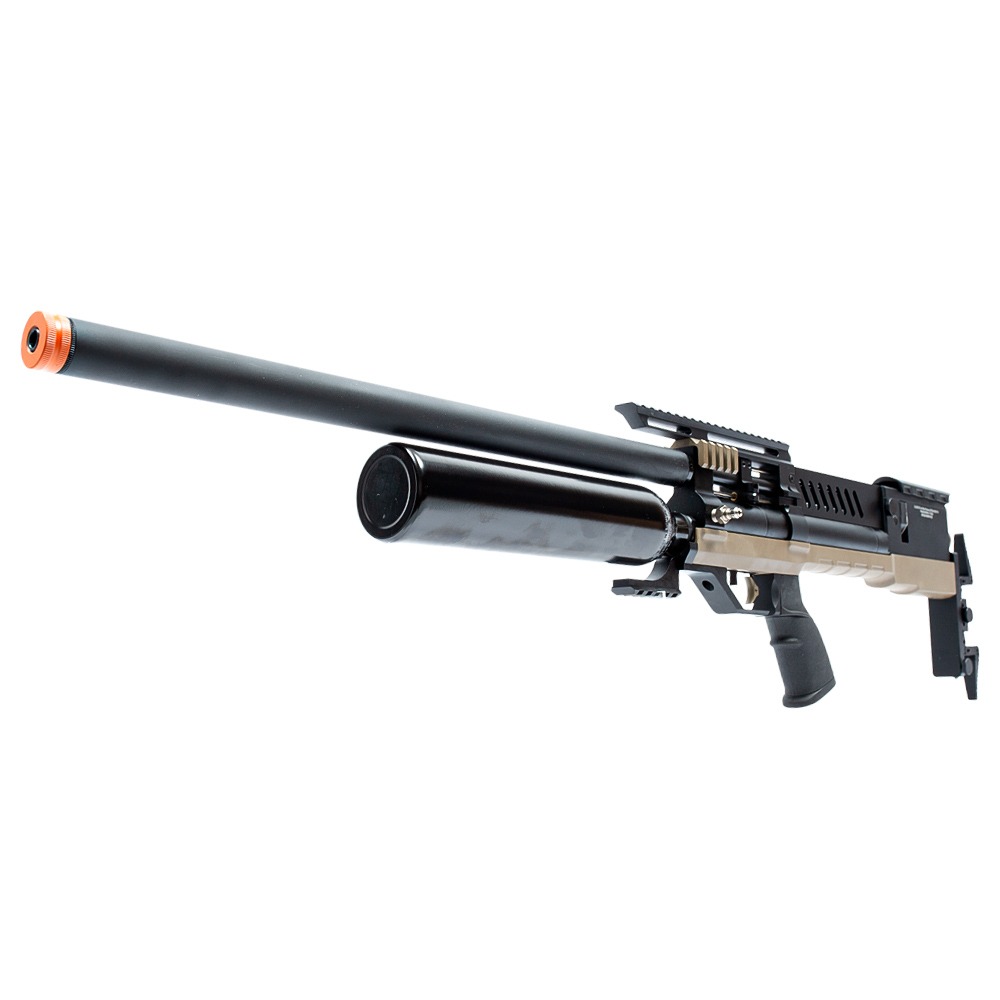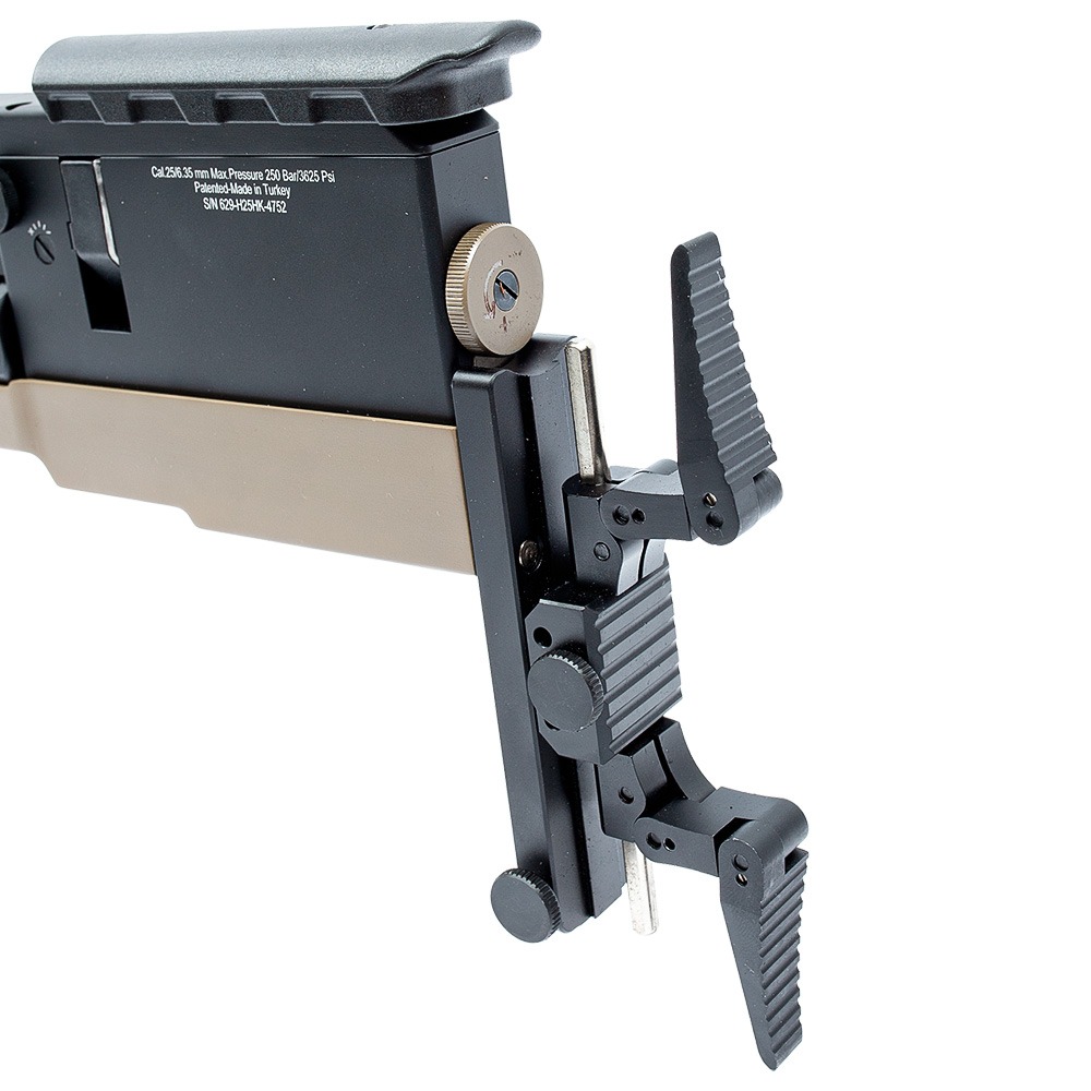 A ergonomia é reforçada pela coronha bullpup em alumínio e pela soleira ajustável em três eixos, permitindo adaptação ao atirador e maior conforto durante o uso. O regulador de pressão integrado mantém consistência entre disparos, favorecendo agrupamentos uniformes.