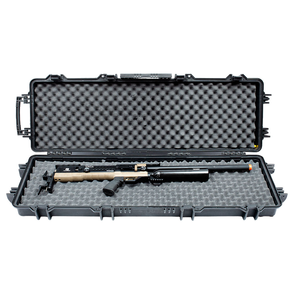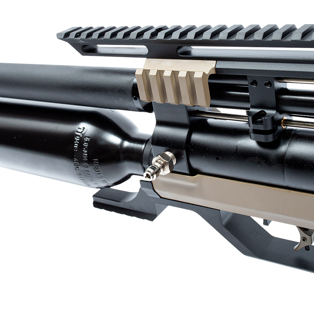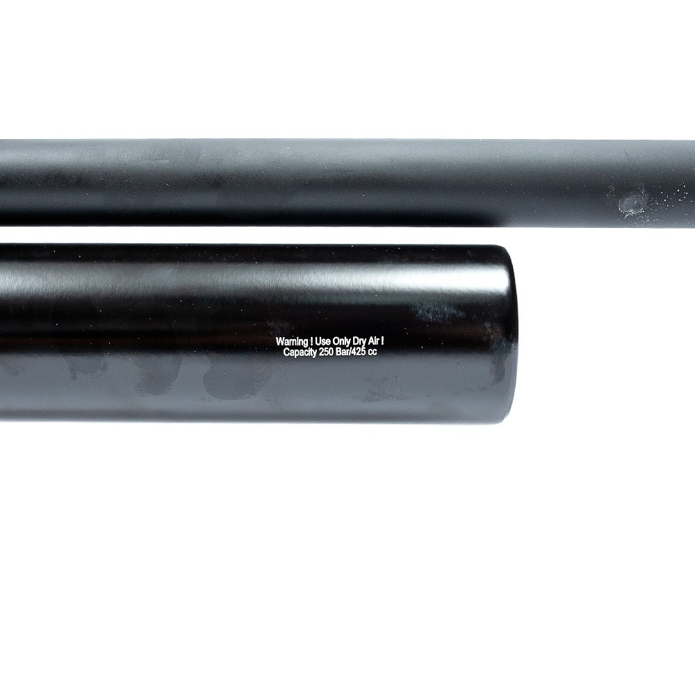 Equipada com sistema PCP regulado, a carabina conta com um conjunto de ar de grande volume formado por cilindro de carbono de 480 cc e pré câmara de 90 cc, totalizando 570 cc. Essa configuração permite enchimento de até 250 bar e oferece aproximadamente 120 disparos consistentes dentro da faixa ideal de pressão, garantindo eficiência e confiabilidade em uso esportivo.