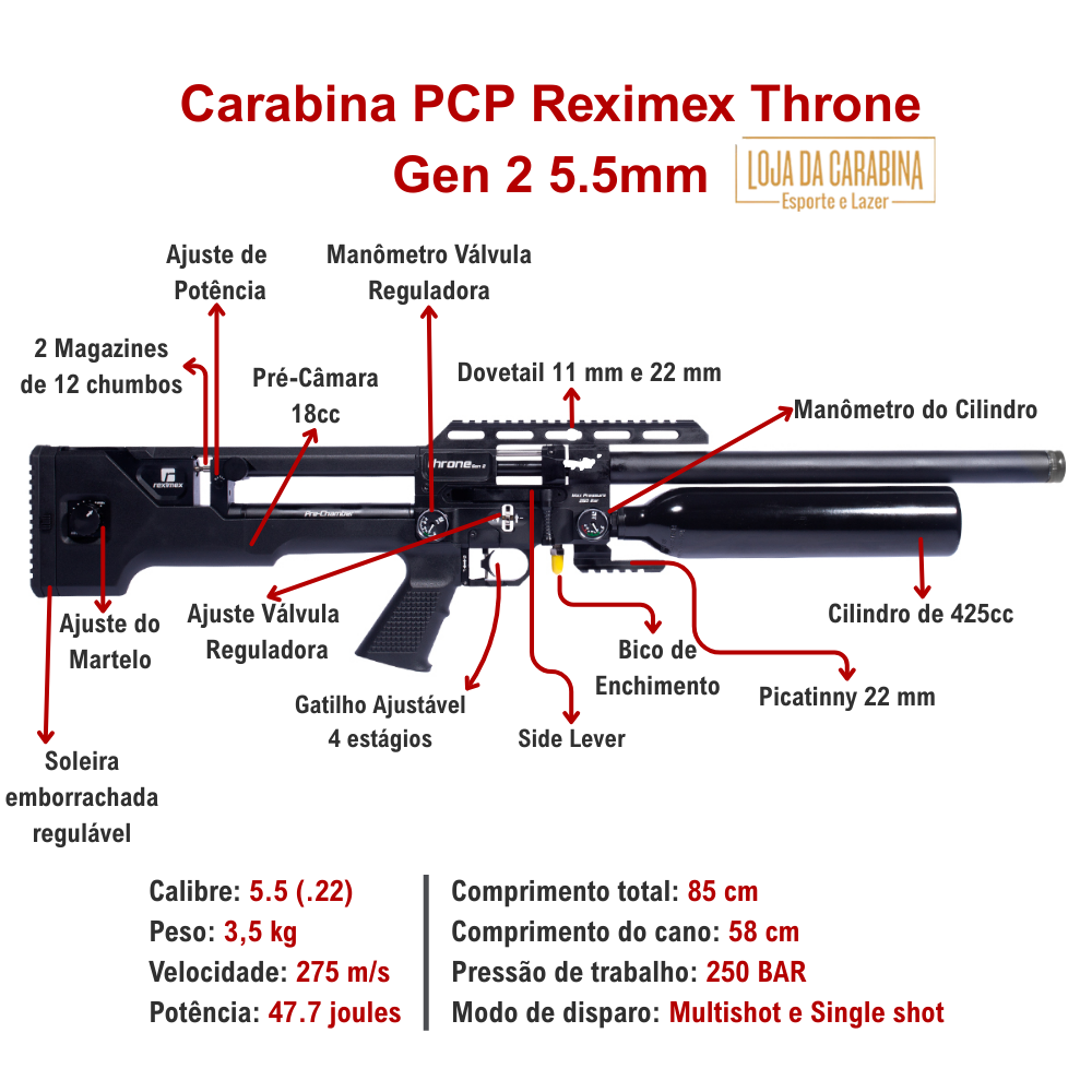 A Carabina PCP Reximex Throne Gen 2 5.5mm é uma das plataformas mais modernas e completas já produzidas pela Reximex. Projetada para oferecer alta precisão, ergonomia e desempenho constante, ela combina um design tático compacto com recursos avançados que elevam a experiência do atirador. Trabalhando no calibre 5.5 mm (.22), atinge 275 m/s (935 fps) com potência de 47.7 joules, garantindo tiros fortes, estáveis e altamente precisos.