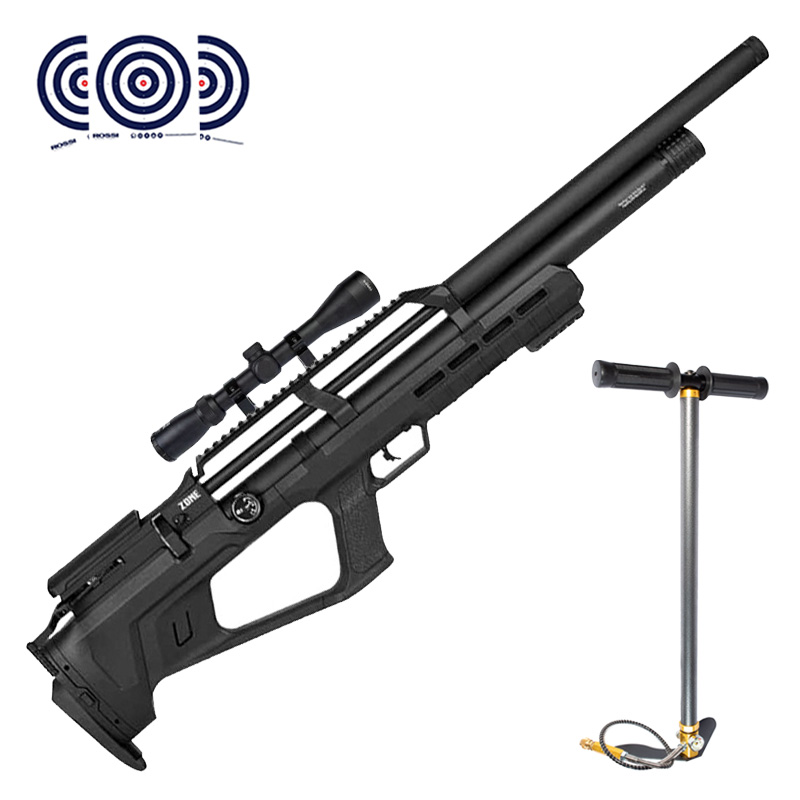 CARABINA PCP ZONE REXIMEX BULLPUP 5.5 MM + LUNETA 3-9X40 SFP + BOMBA MANUAL PCP + ALVOS ROSSI