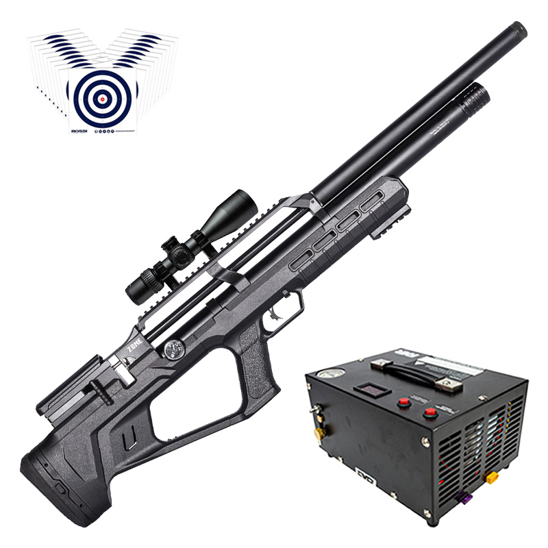 CARABINA PCP ZONE REXIMEX BULLPUP 5.5 MM + COMPRESSOR DE AR + LUNETA 3-12X44 + ALVOS ROSSI