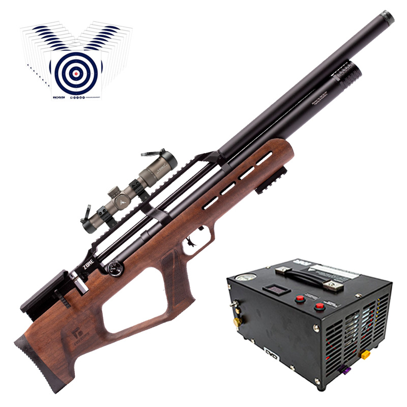 CARABINA PCP ZONE REXIMEX WOOD BULLPUP + COMPRESSOR PORTÁTIL + LUNETA 1.2-6X24 + ALVOS ROSSI
