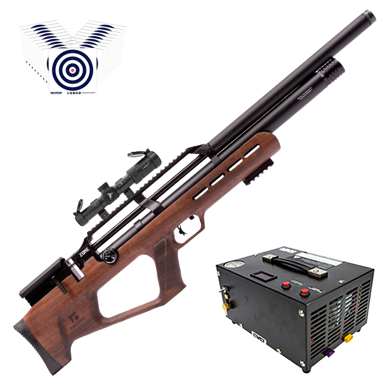 CARABINA PCP ZONE REXIMEX WOOD BULLPUP + COMPRESSOR DE AR + LUNETA 1-6X24 + ALVOS ROSSI