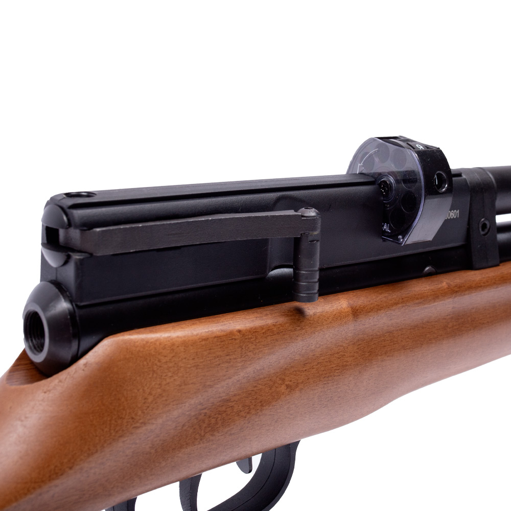 Ela já vem com o bico foster para recarga rápida, o que deixa o processo de recarregar sua carabina mais rápido e sem precisar de acessórios extras.
