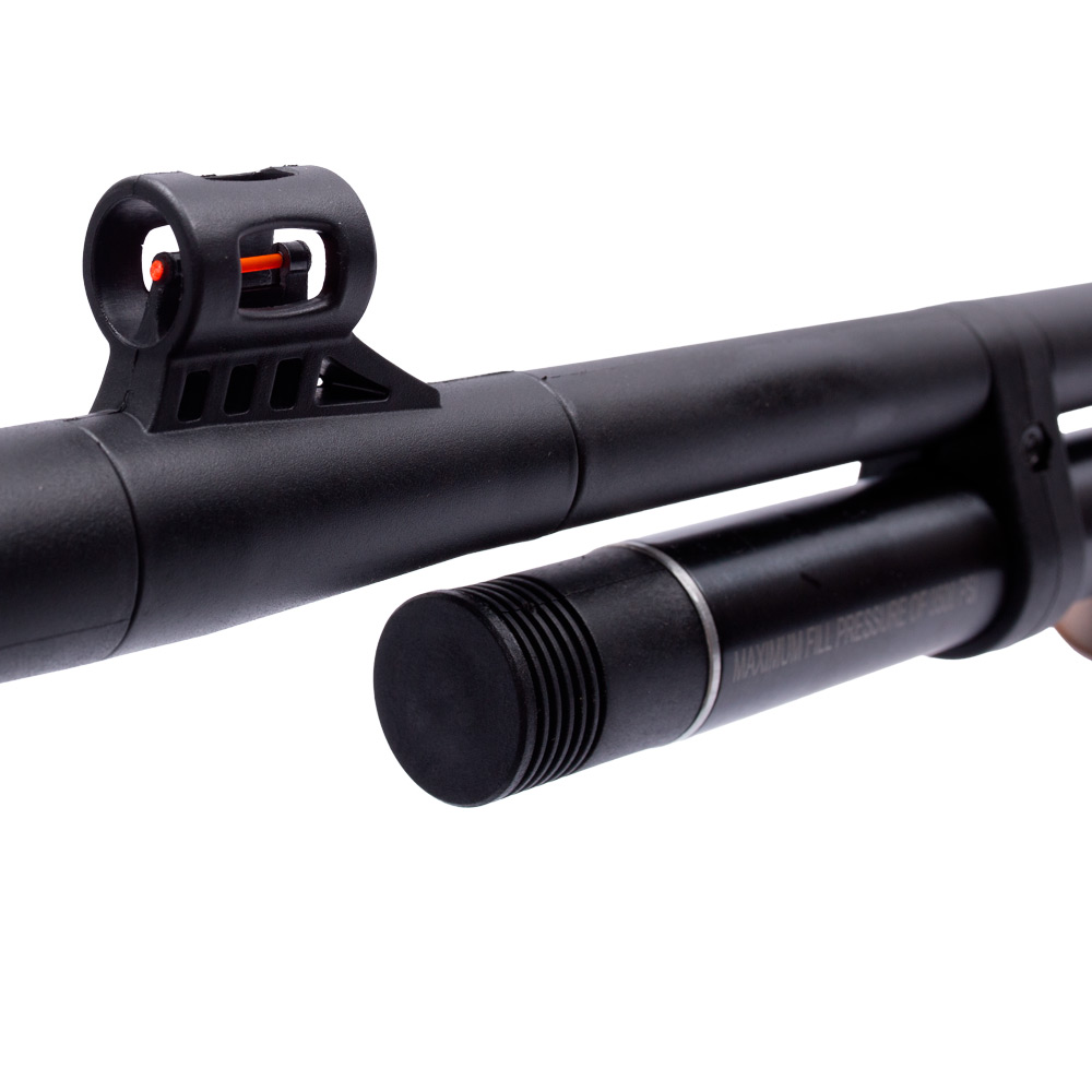 Seu castelo é em polímero e conta com trilho para luneta de 11mm e seu cano é raiado, proporcionando uma melhor aerodinâmica para o chumbinho no momento dos disparo. Na ponta do cano, que mede 49 centímetros, temos um supressor integrado, que corresponde as expectativas e suprime o som do disparo de forma muito satisfatória.