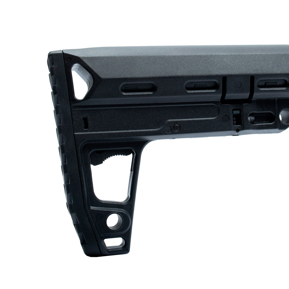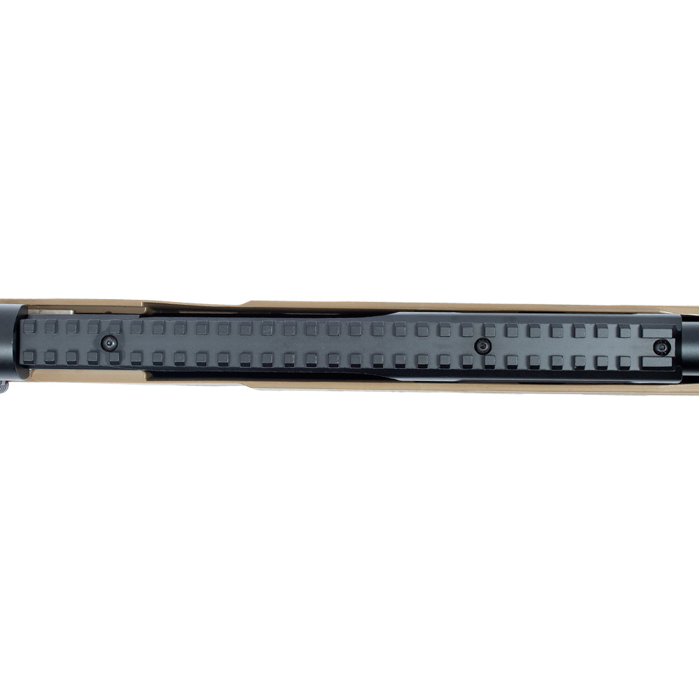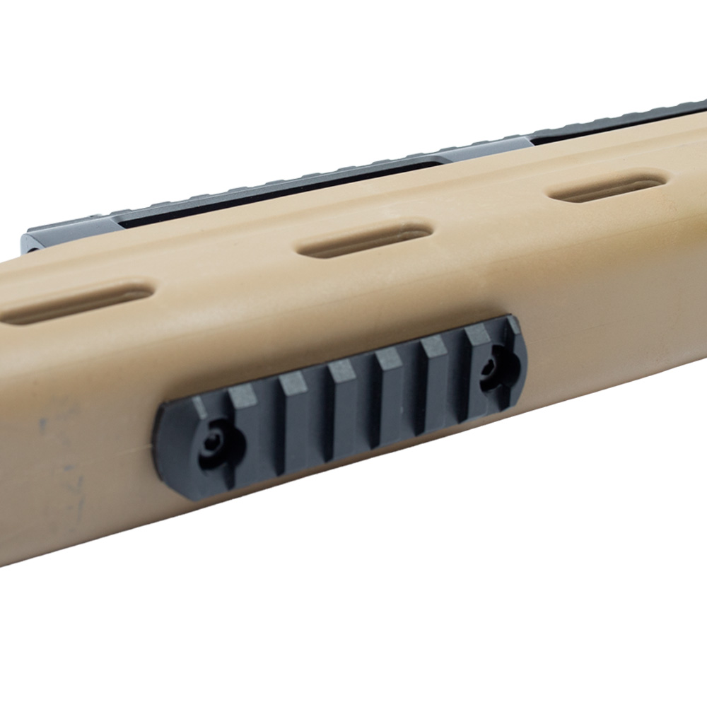 Equipada com trilho superior e inferior Picatinny de 22 mm, permite a instalação de lunetas, red dots, bipés e outros acessórios, reforçando seu aspecto tático e funcional.