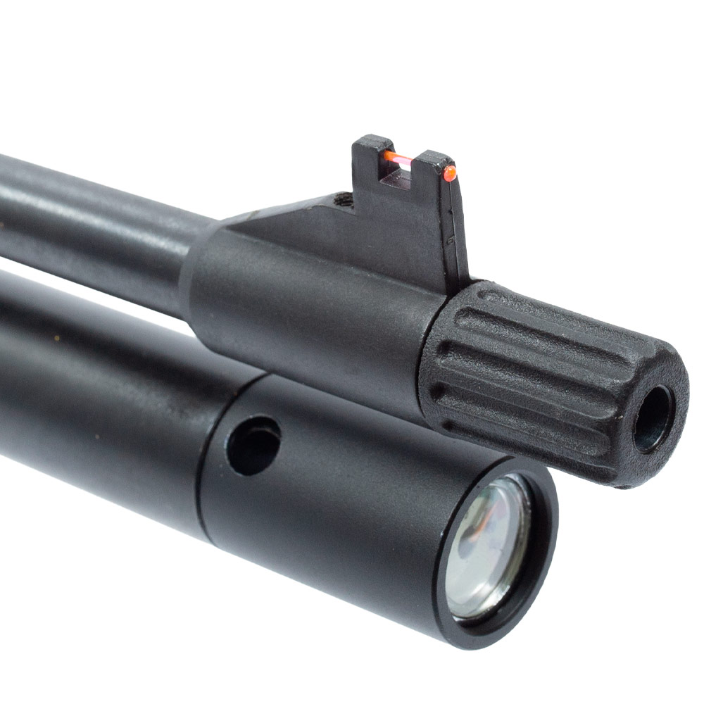 A carabina conta com trava de segurança manual, manômetro integrado na ponta do cilindro para monitoramento da pressão e gatilho ajustável em peso.