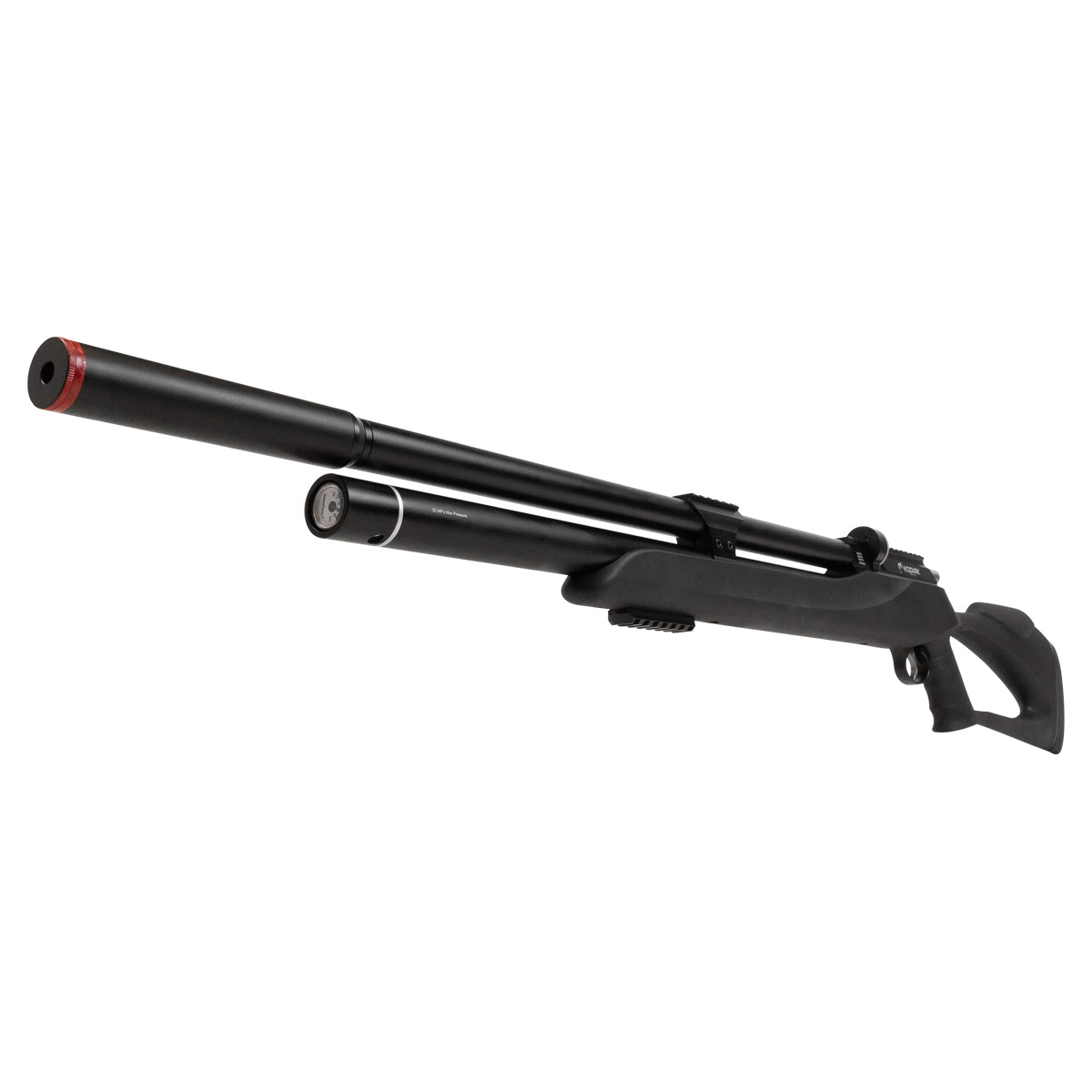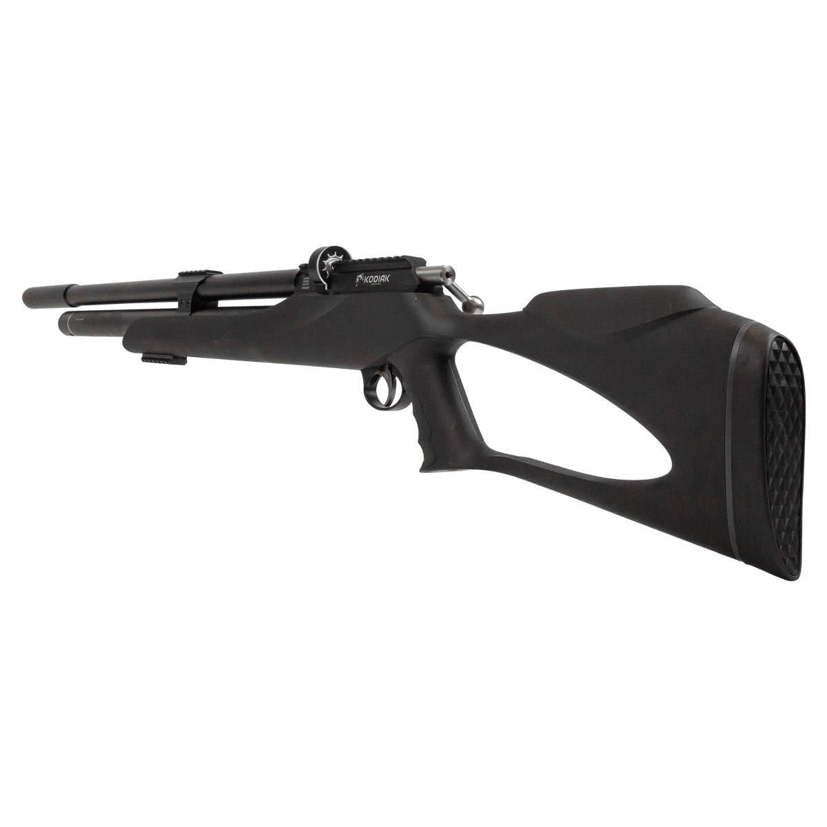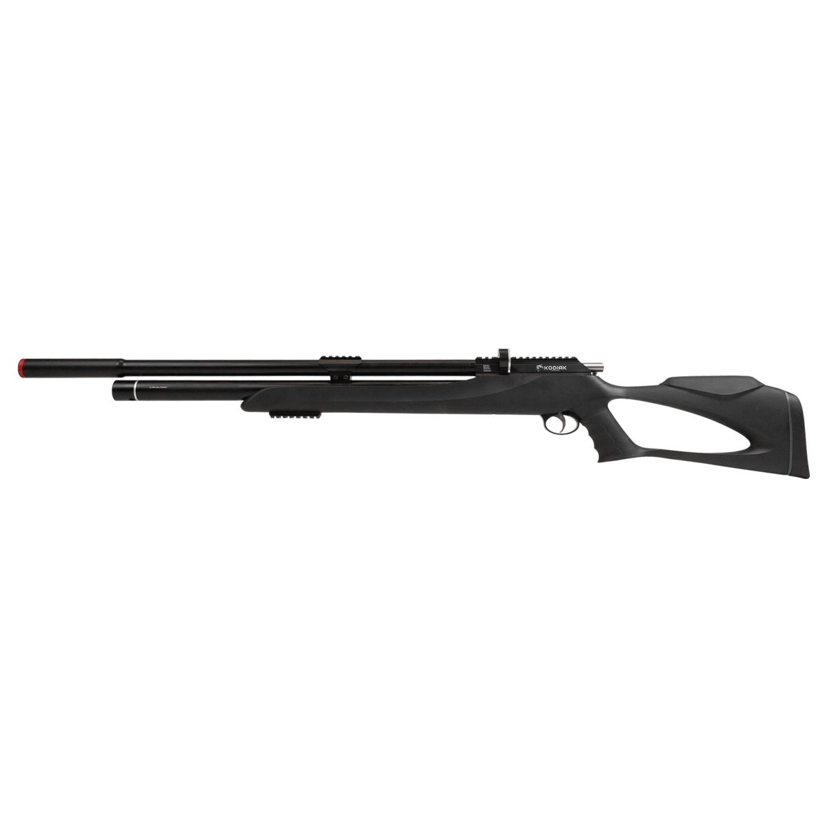 O cano da Kodiak possui impressionantes 55 centímetros (550 mm), o que auxilia muito na precisão da arma. Também possui airstripper e um supressor de ruído que garante disparos mais silenciosos!