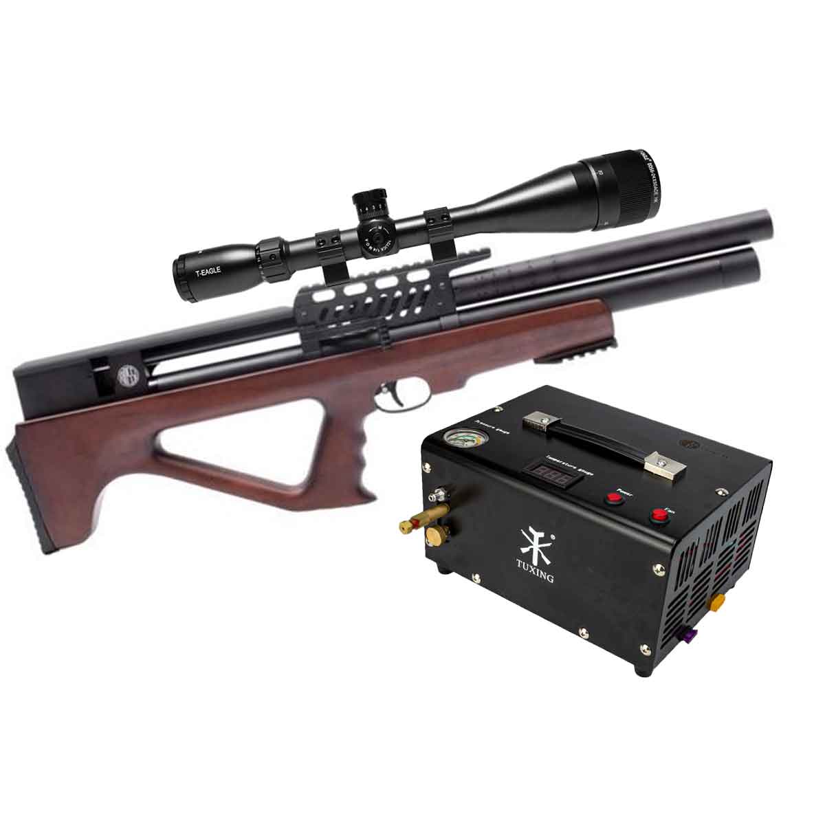 CARABINA PCP R35 ROSSI BULLPUP EM MADEIRA 5.5 MM + LUNETA T-EAGLE EOS 6-24X50 AOE HK 11MM + COMPRESSOR PORTATIL PCP