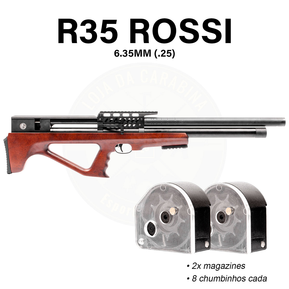 A carabina bullpup Rossi R35 PCP 6.35mm (.25 cal) é um modelo big bore desenvolvido para atiradores que buscam alto desempenho, potência real e precisão consistente em um conjunto compacto e moderno.