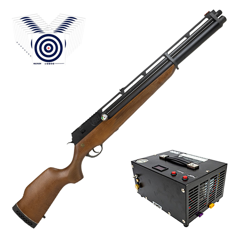 CARABINA PCP ROSSI R8 COM VÁLVULA REGULADORA 5.5 MM MADEIRA + COMPRESSOR FXR + ALVOS ROSSI