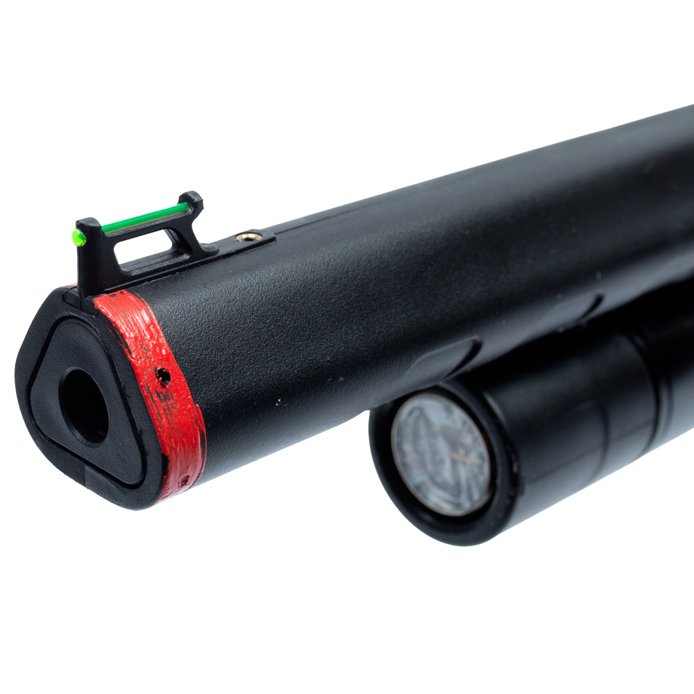 Vem com conjunto de mira aberta instalado, sendo alça de mira ajustável e massa de mira fixa com fibra óptica verde.