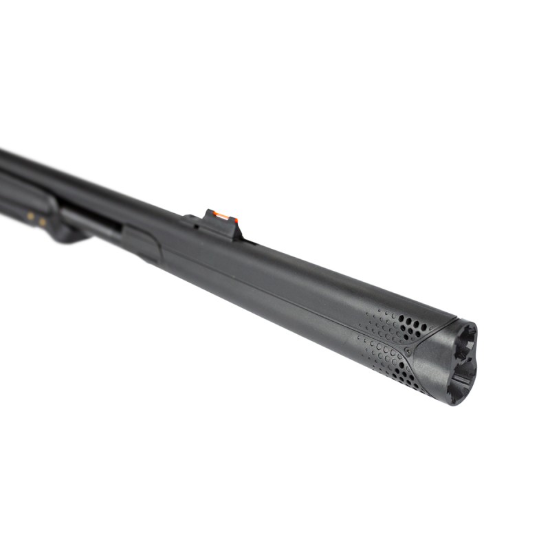 Outro detalhe importantíssimo é o supressor desta carabina. É um supressor com sistema Air Stripper. Esse sistema permite que o chumbinho não sofra com a turbulência da pressão na saída do cano, os gases são contidos internamente e liberado depois do chumbinho, tornando o tiro mais preciso.