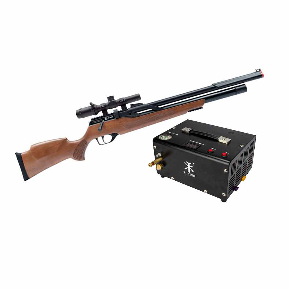 Carabina PCP T-Rex 6.35mm Montecarlo Rossi VR Madeira Big Bore + Compressor + Luneta 1-7x24 Artemis
