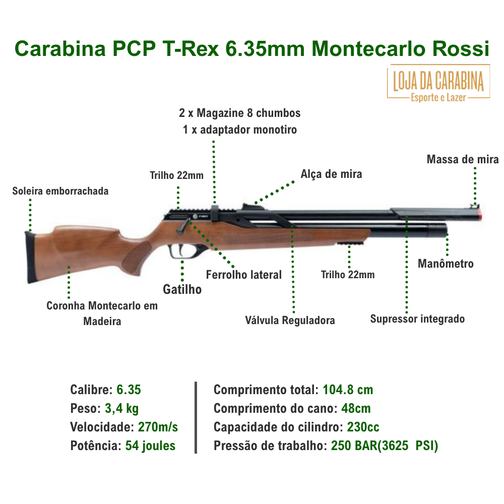 Carabina PCP T-Rex 6.35mm Rossi VR Madeira Big Bore + Bomba Manual PCP + 60un Alvos + Capa + Luneta