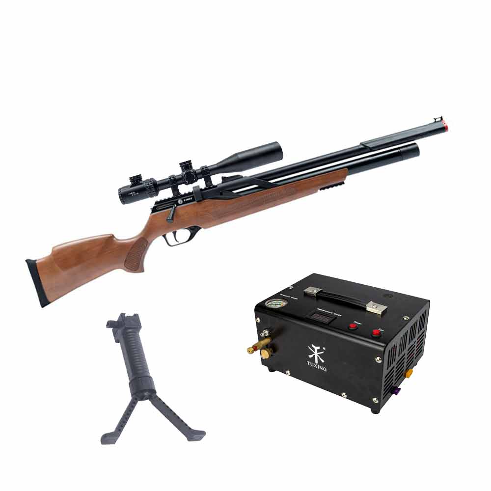 Carabina PCP T-Rex 6.35mm VR Madeira Big Bore + Front Grip Bipe + Compressor + Luneta 3-12X40i Fiber