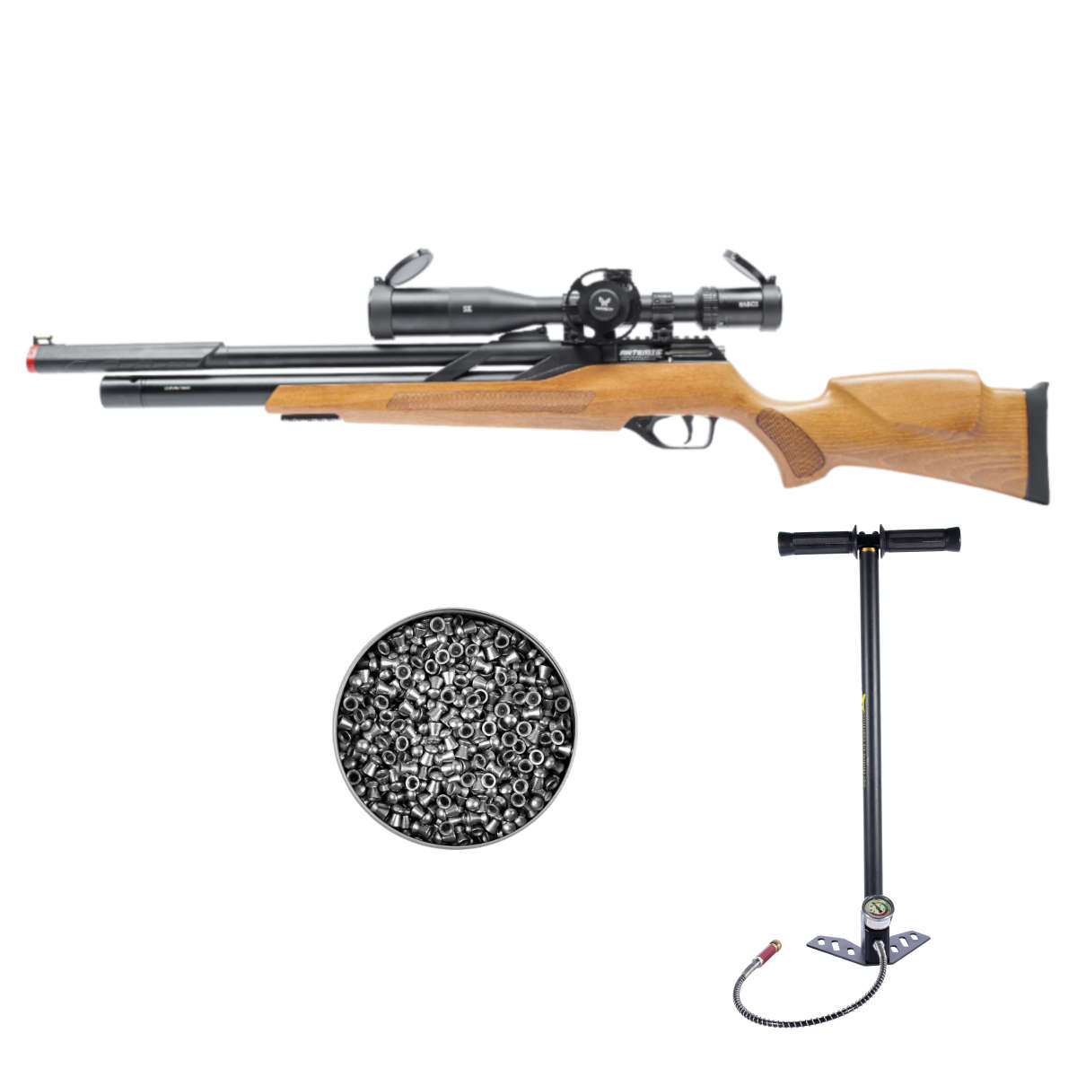 Para completar o conjunto, o combo inclui a Bomba Manual PCP Nova Vista Airgun, desenvolvida para recargas eficientes e seguras de carabinas PCP. Fabricada em aço inoxidável, conta com vedações em viton e borracha, oferecendo alta durabilidade e excelente vedação.