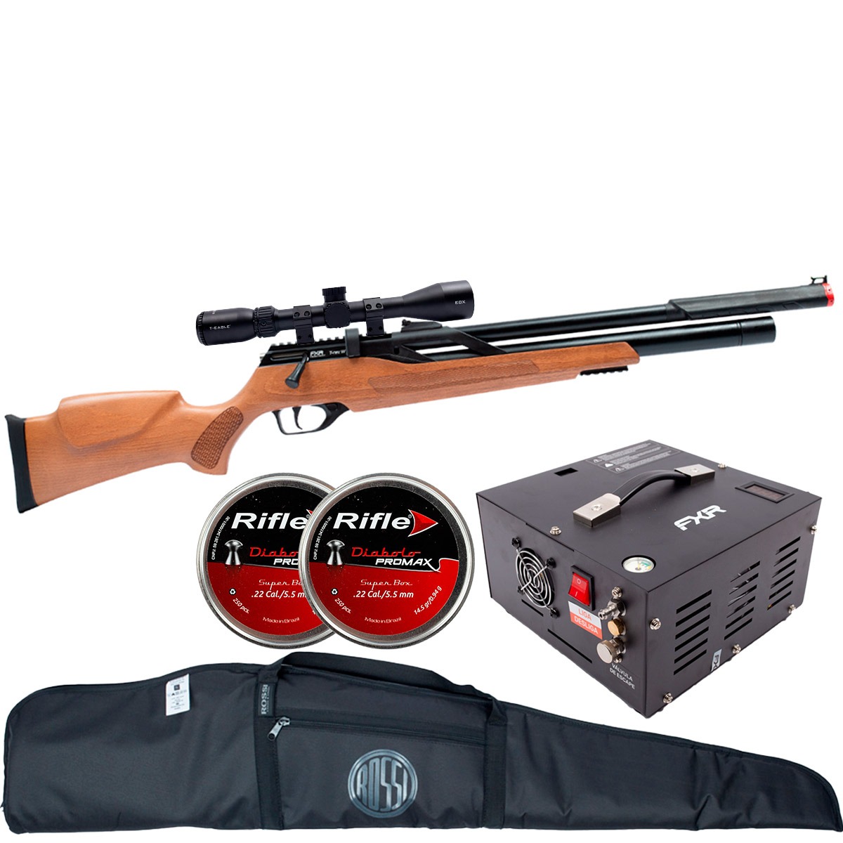 O kit acompanha chumbinhos 5.5mm, ideais para prática de tiro com boa precisão e desempenho, além de um compressor portátil FXR Tuxing com pressão de trabalho de até 300 bar. Compacto e eficiente, permite o enchimento rápido do cilindro da carabina, podendo ser utilizado em 110v, 220v ou 12v, oferecendo praticidade tanto em casa quanto em campo. Conta com sistema de ventilação integrado, display de temperatura e acompanha acessórios para operação.