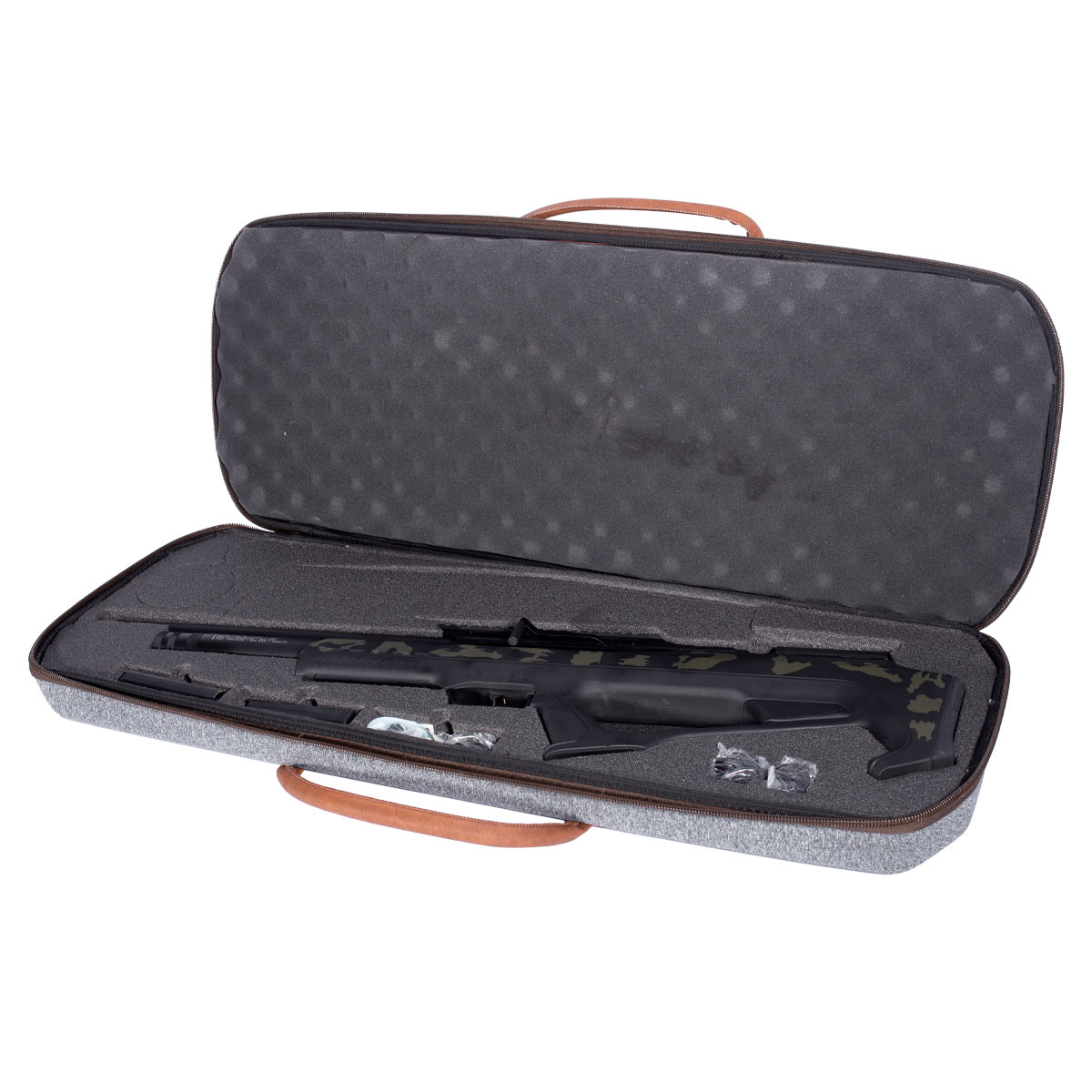 Acompanha capa personalizada Effecto cinza que possui detalhes em veludo e alça de mão para transporte. Internamente possui espuma perfilada no e espuma formato casca de ovo que garante maior proteção para a sua Carabina durante o armazenamento e transporte. Abertura por zíper.