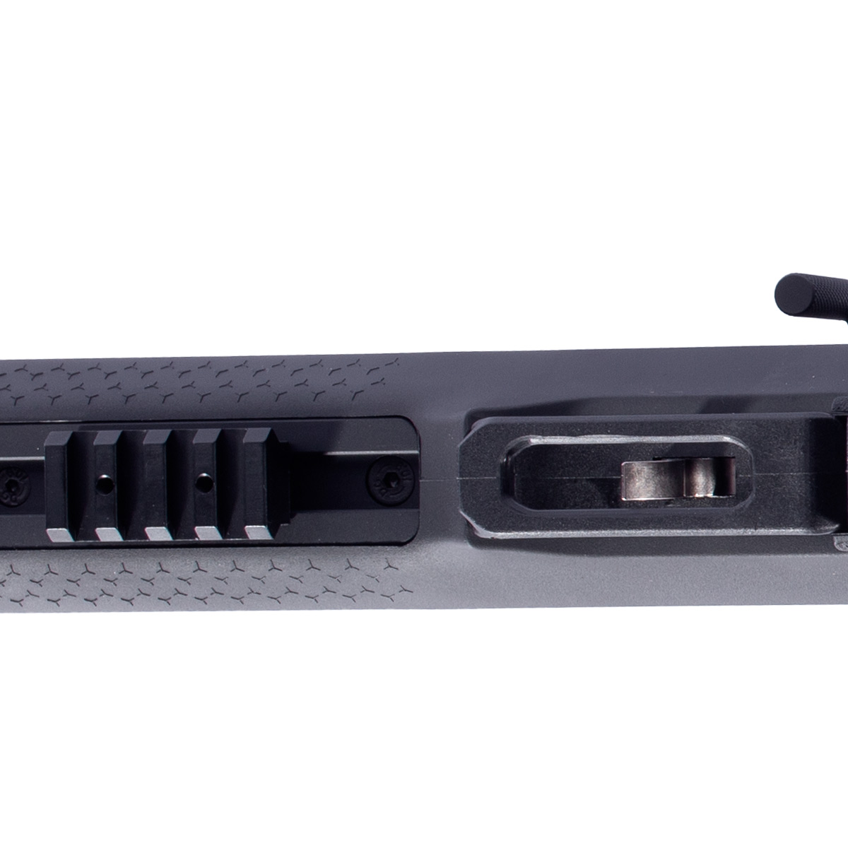 Conta com trilho picatinny 20 mm na parte superior, sendo um trilho elevado para instalação de luneta ou red dot. E um trilho na parte inferior para instalação de bipé para disparos com apoio. O uso de uma mira óptica é indispensável nessa Carabina, pois ela não possui conjunto de mira aberta instalada.