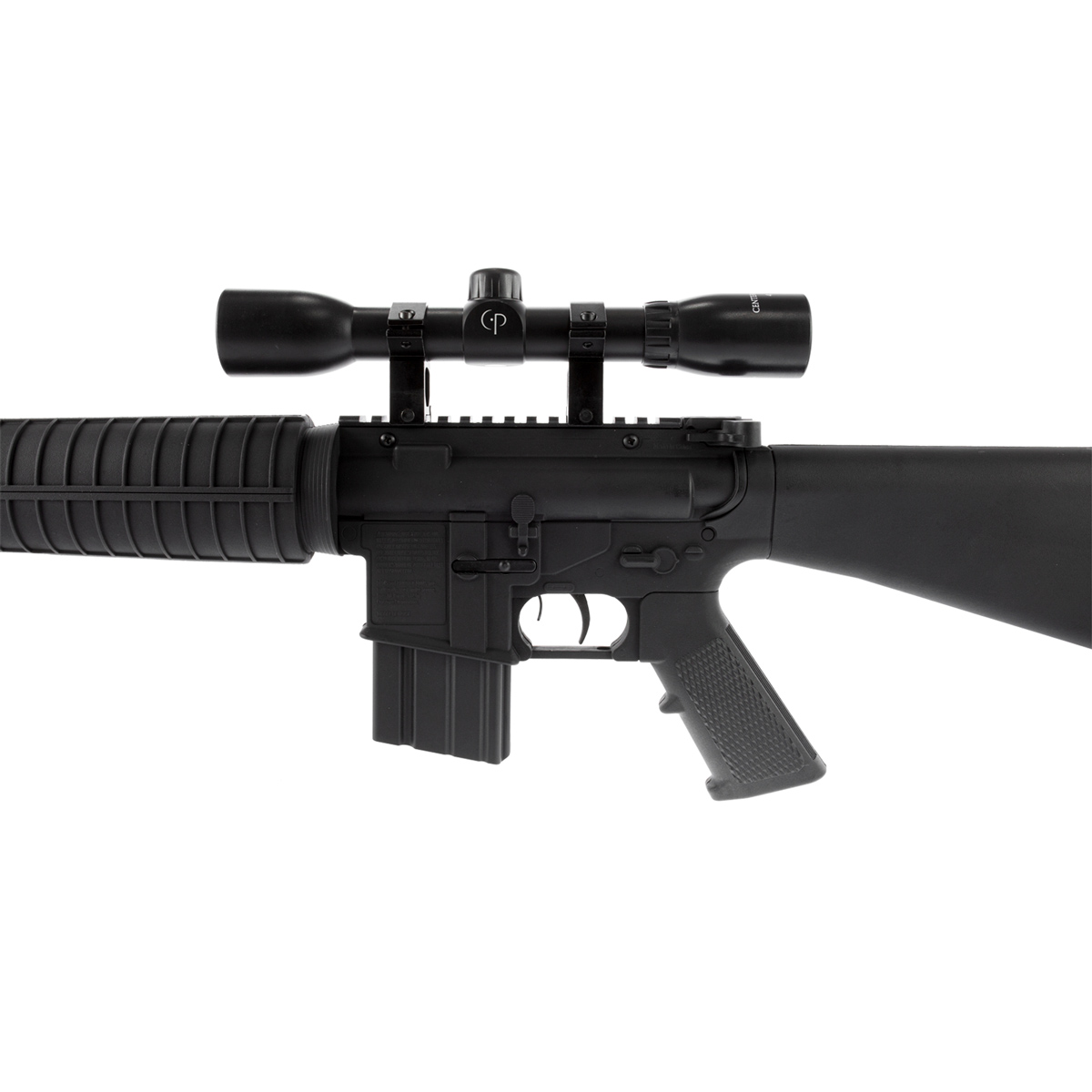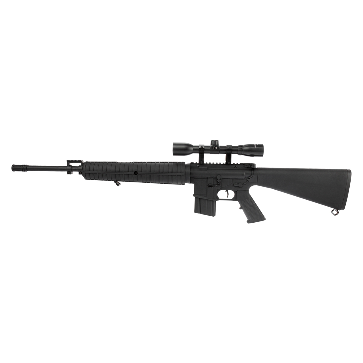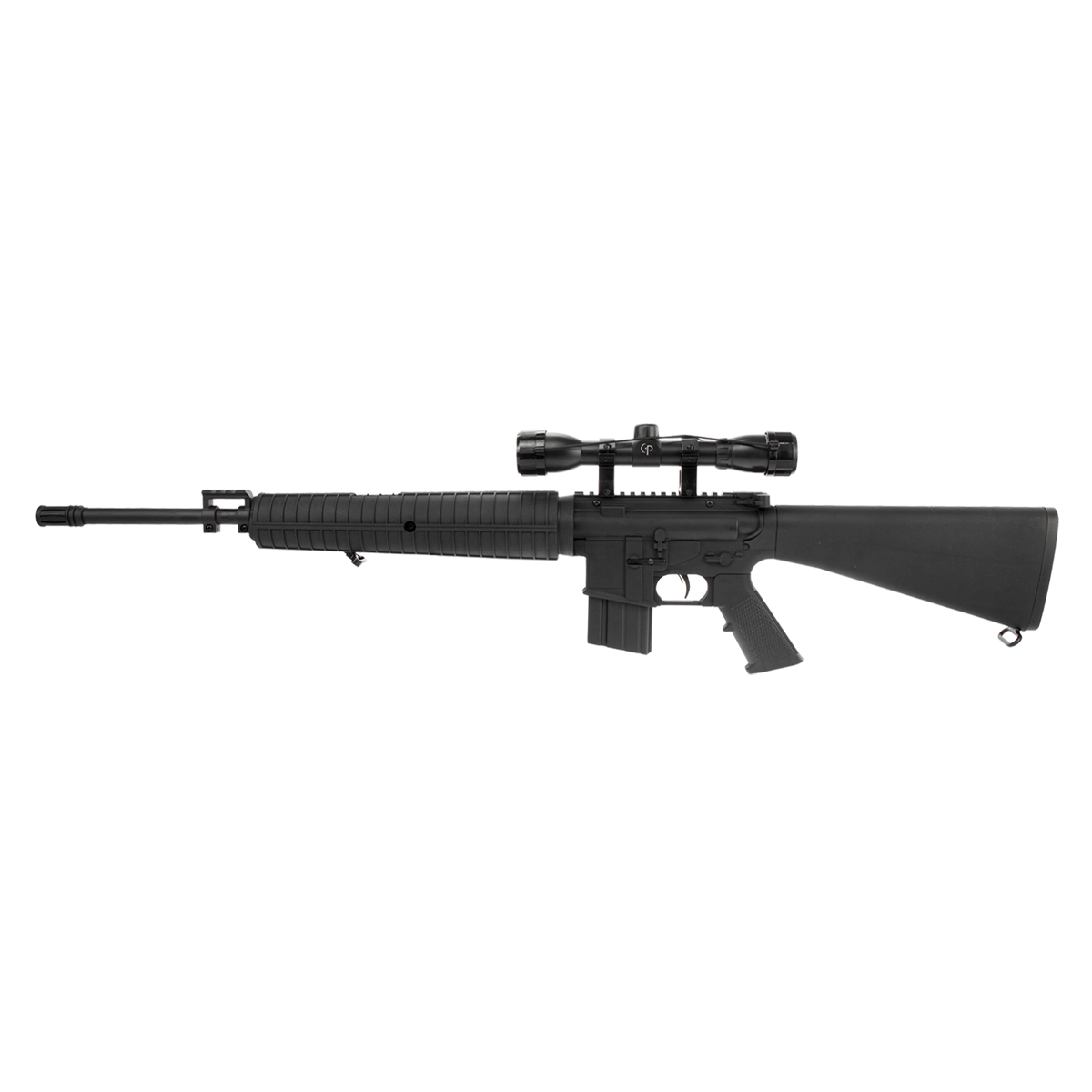 É uma carabina que simula um Rifle de Pressão, conta com coronha fixa em polímero, e com uma incrível potência.