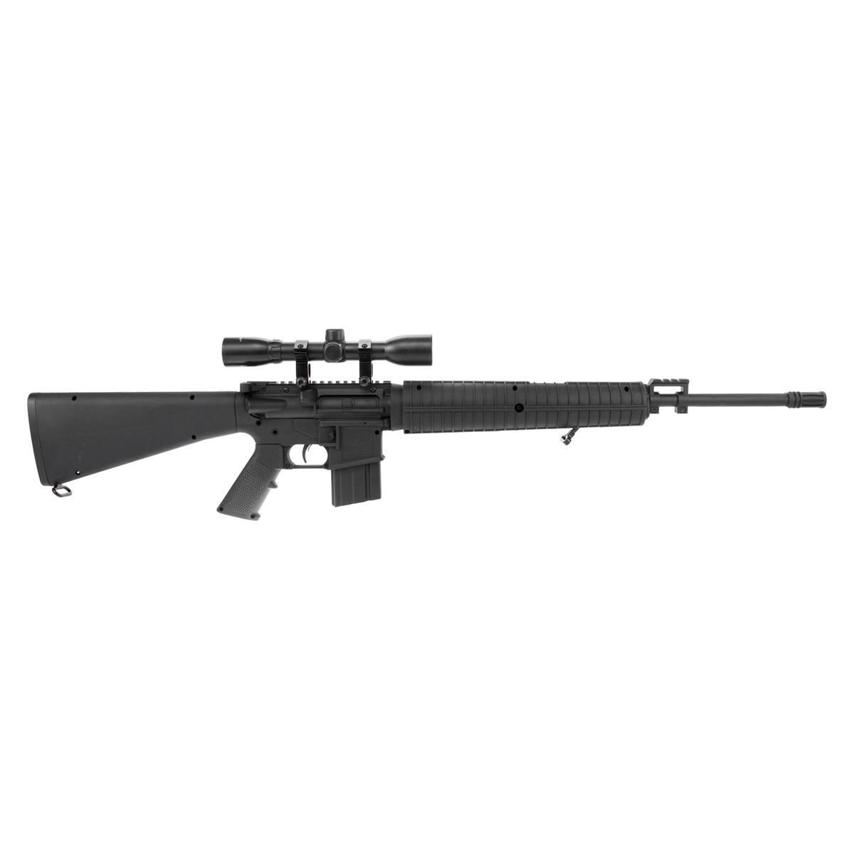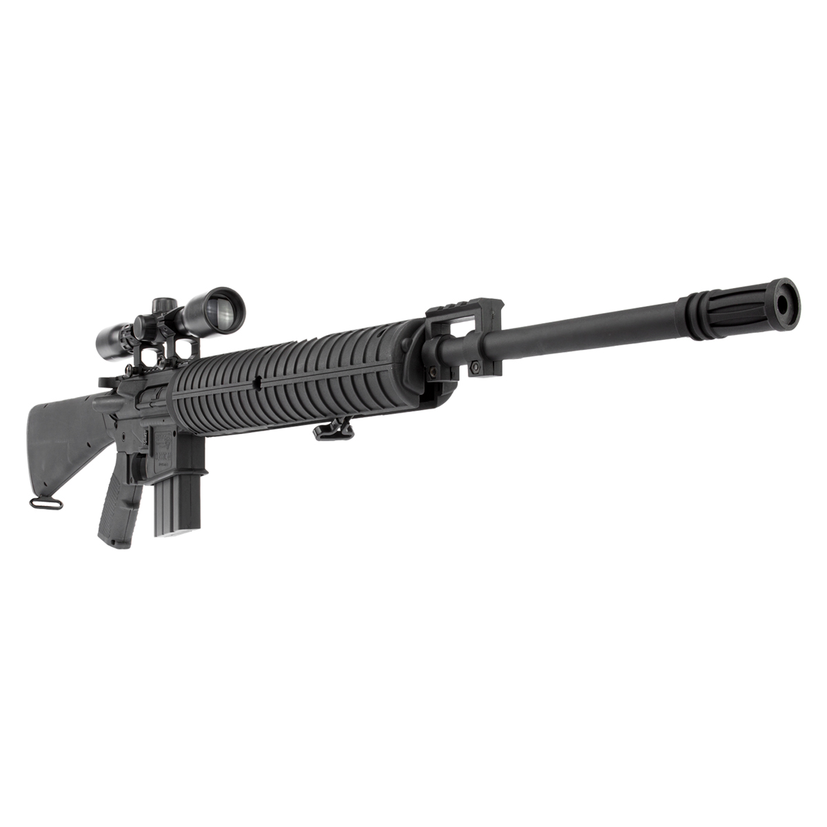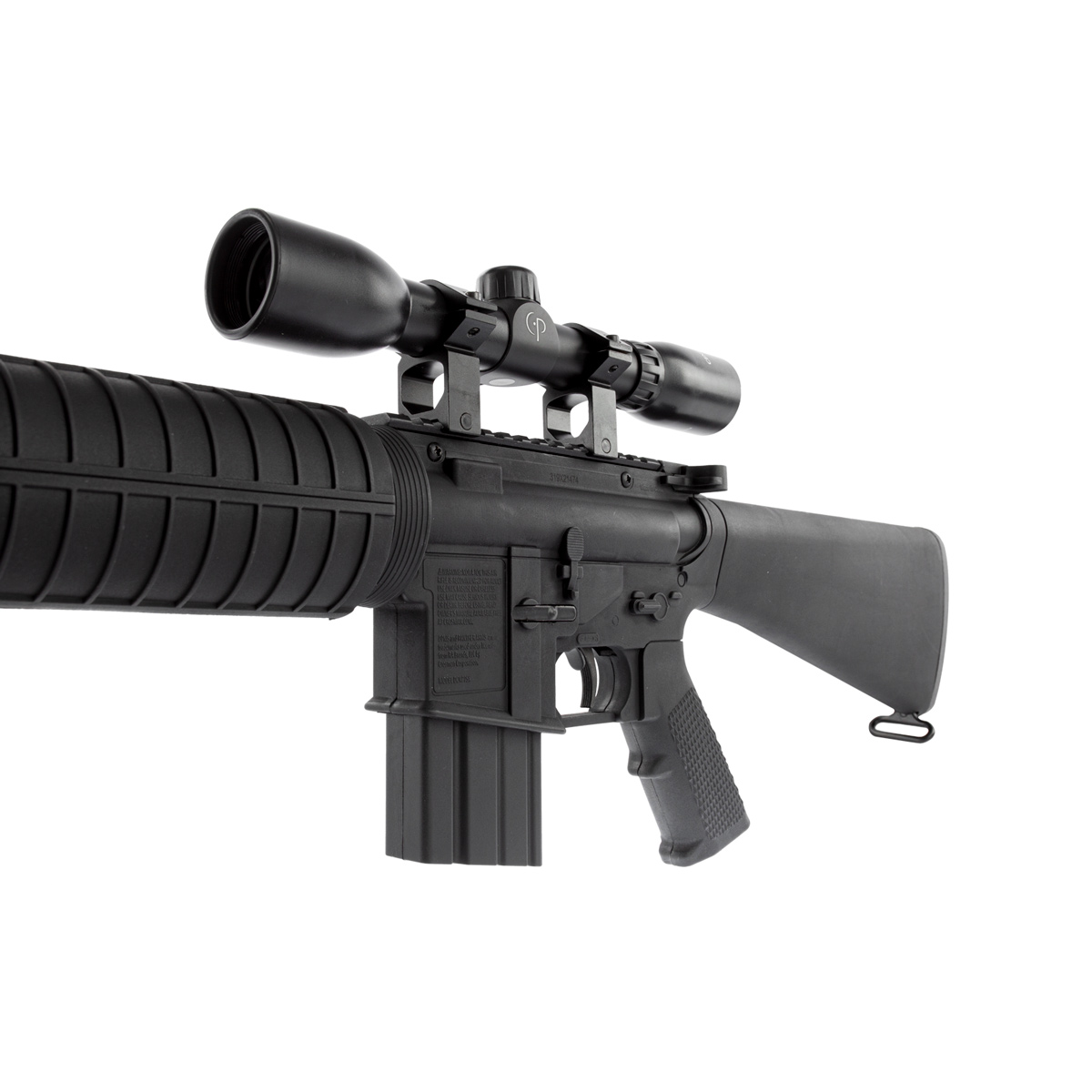 É uma carabina que simula um Rifle de Pressão, conta com coronha fixa em polímero, e com uma incrível potência.