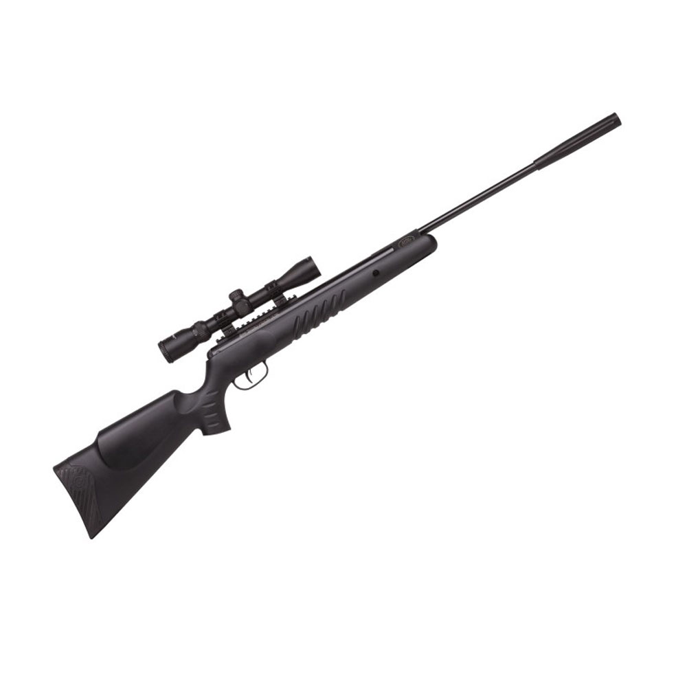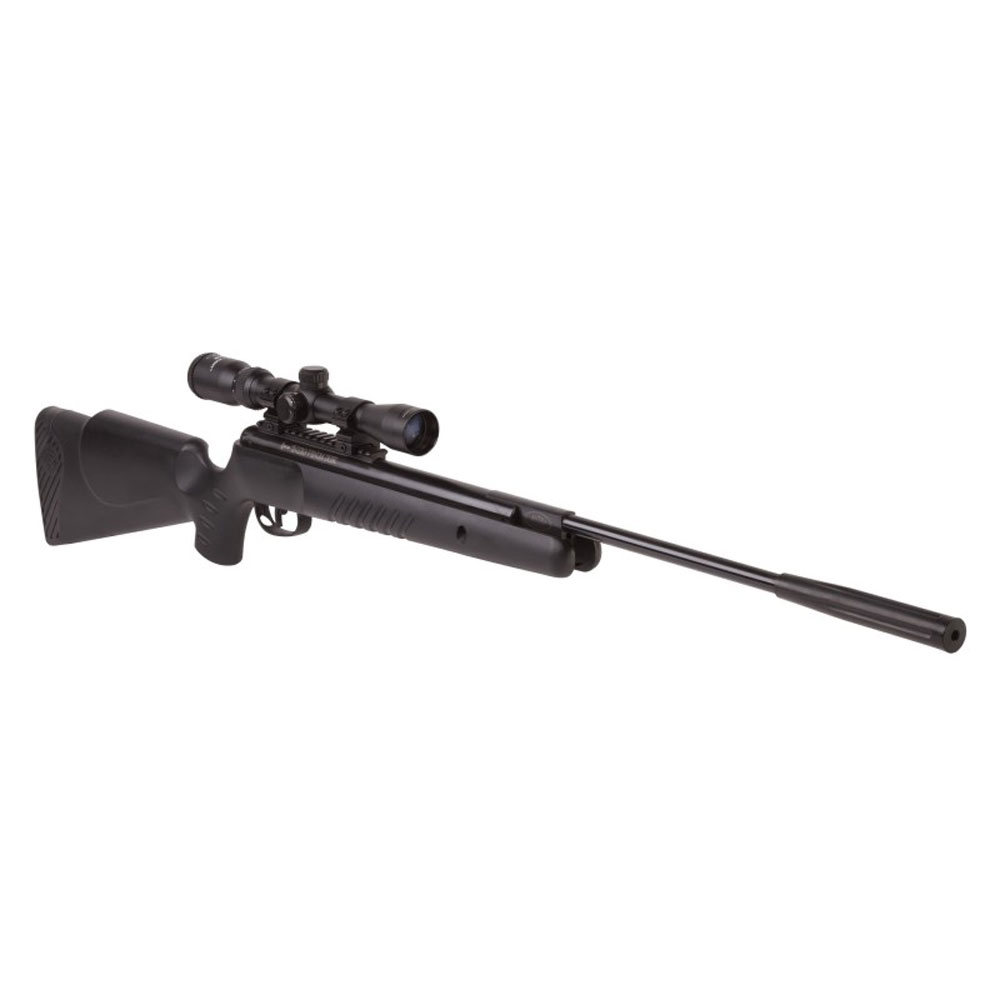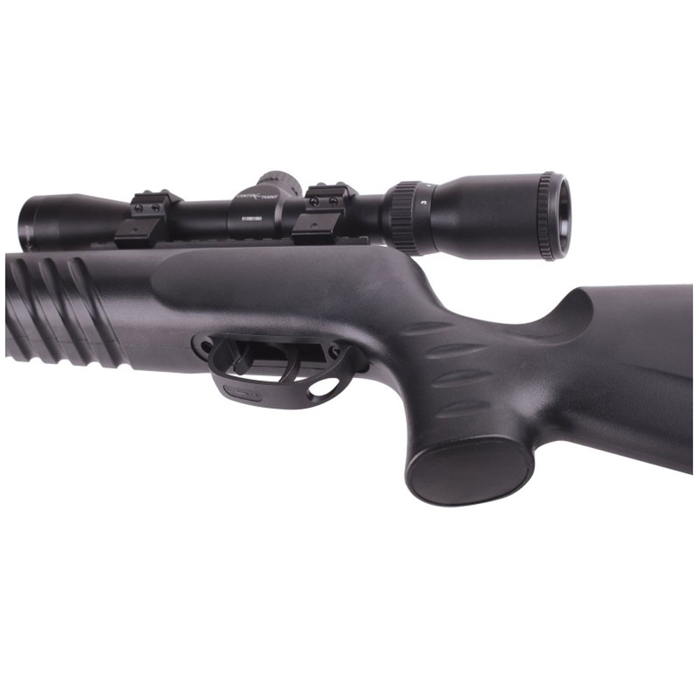 Este arma de pressão é equipada com uma luneta CenterPoint 4x32 e um sistema de montagem óptico rápida e fácil.