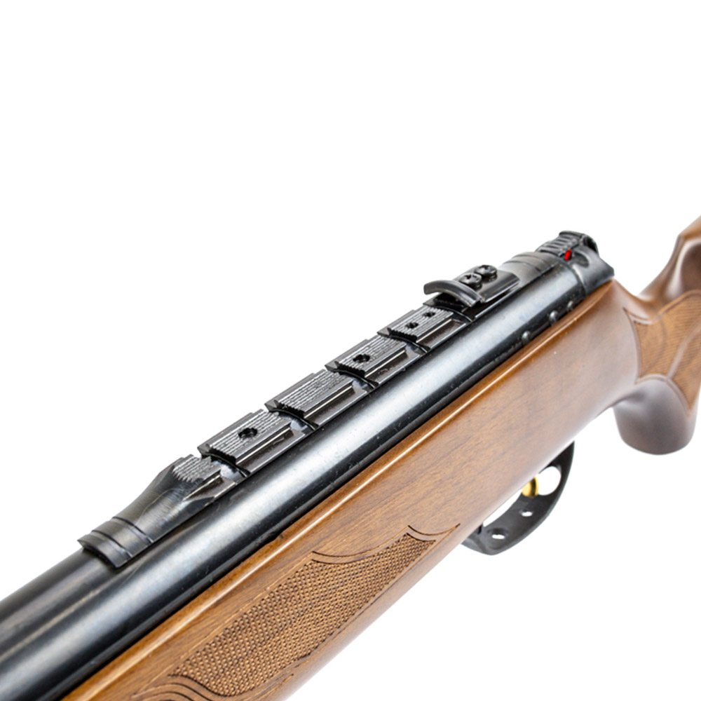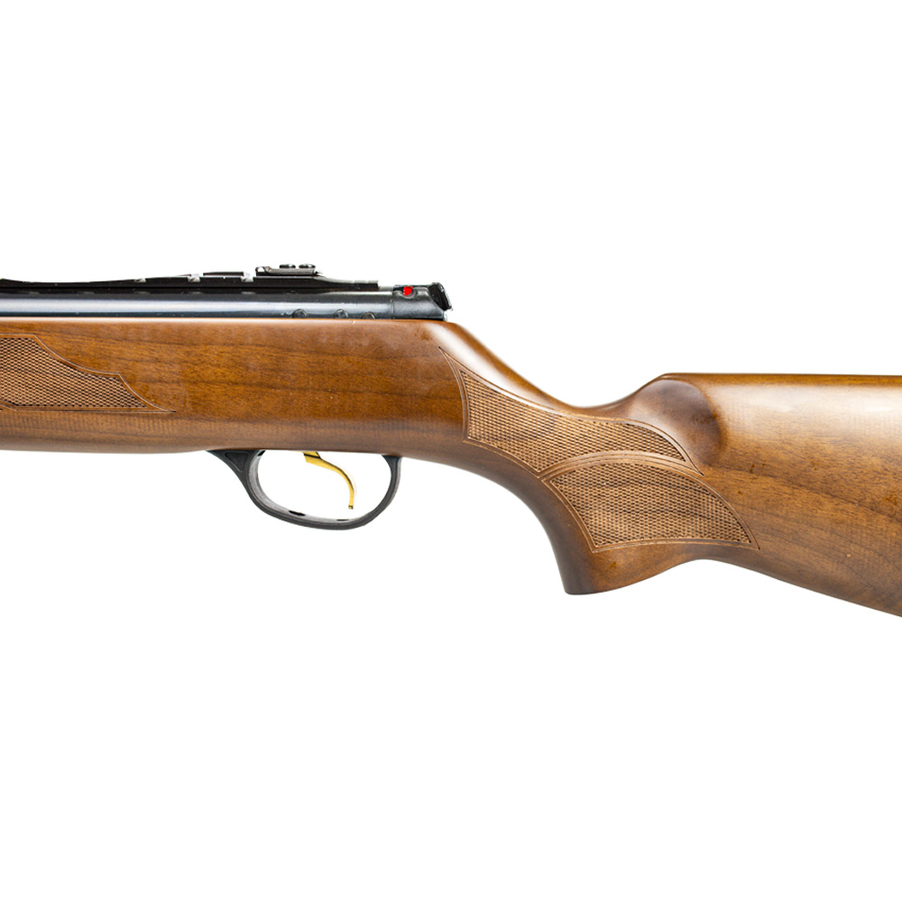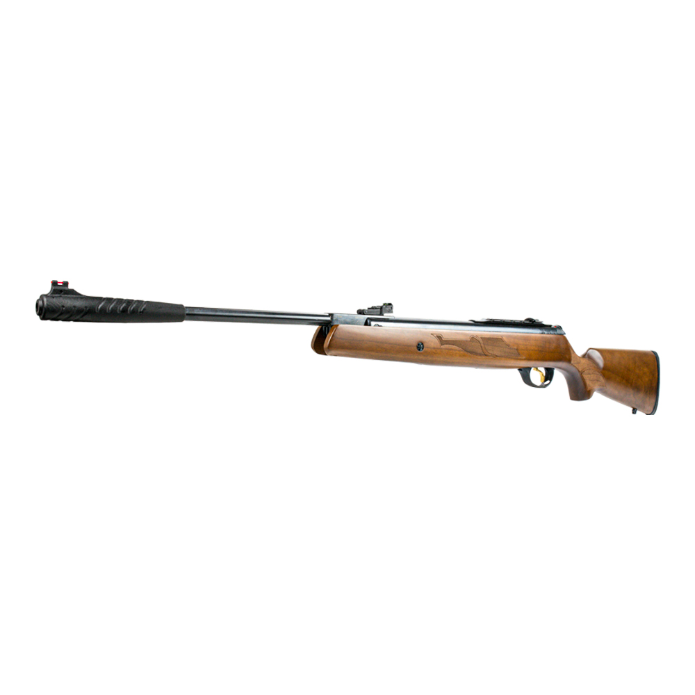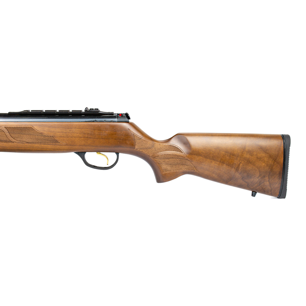 Arma de pressão com coronha em madeira. É um lindo modelo fabricado pela Hatsan, com ação por mola no calibre 5.5mm (.22), utilizando chumbinho como munição.