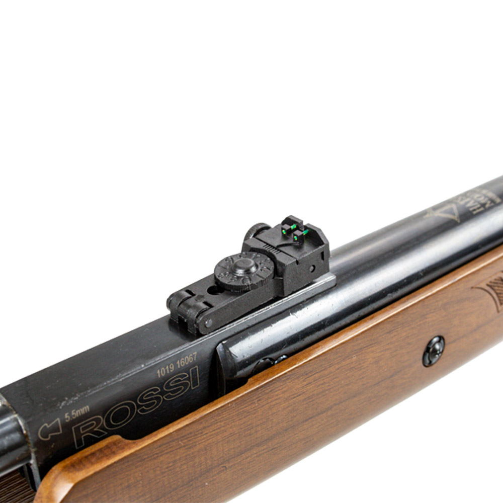 Alça de mira com ajuste horizontal e vertical e fibra óptica verde. Massa de mira fixa com fibra óptica vermelha.