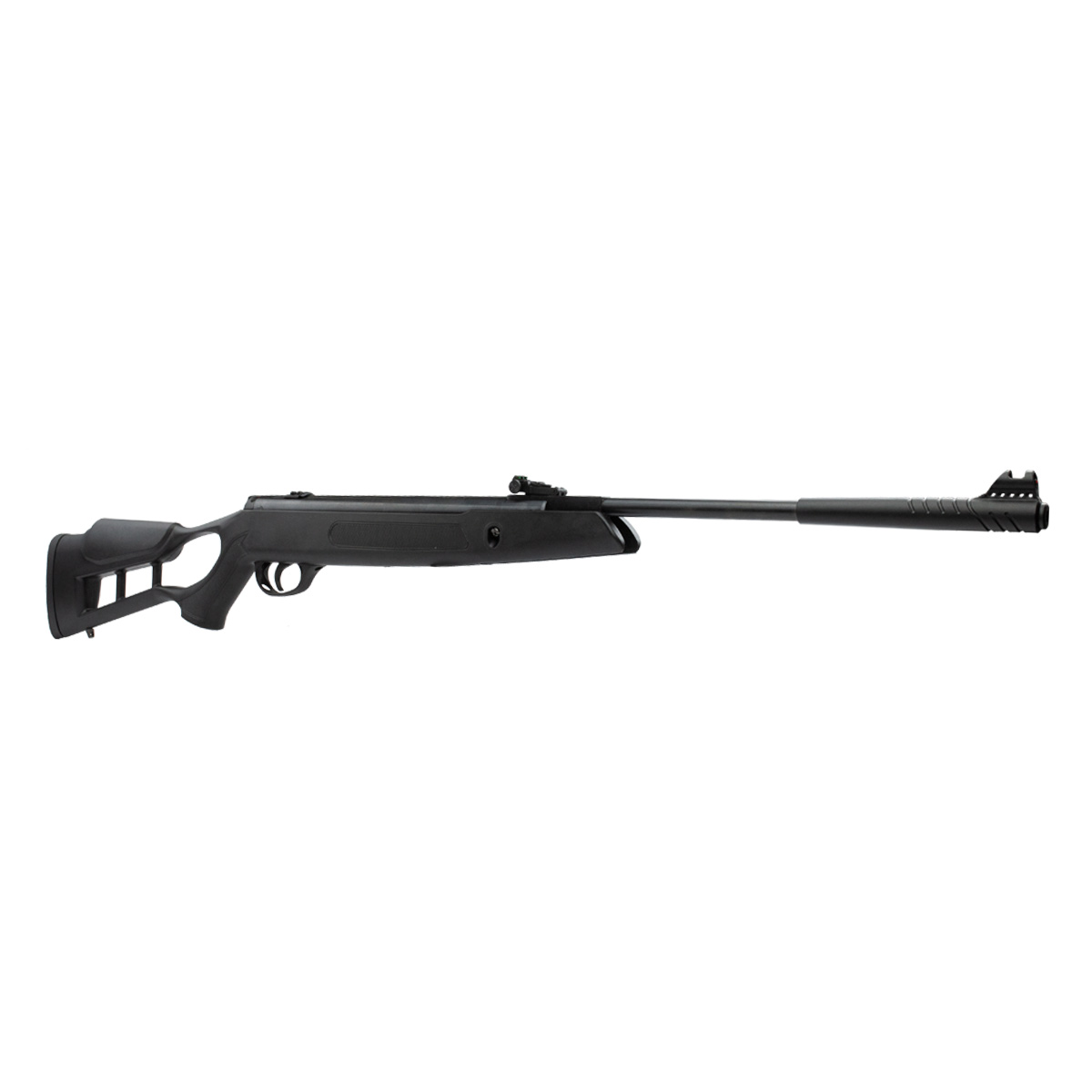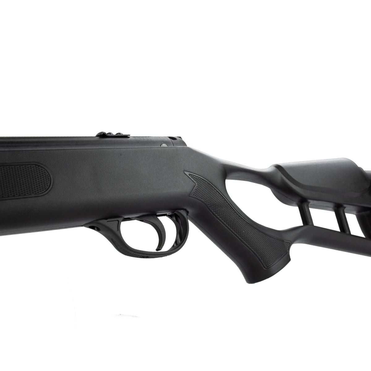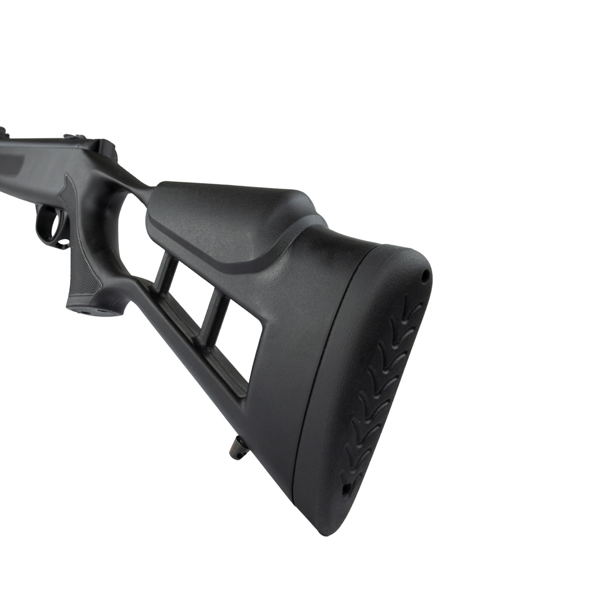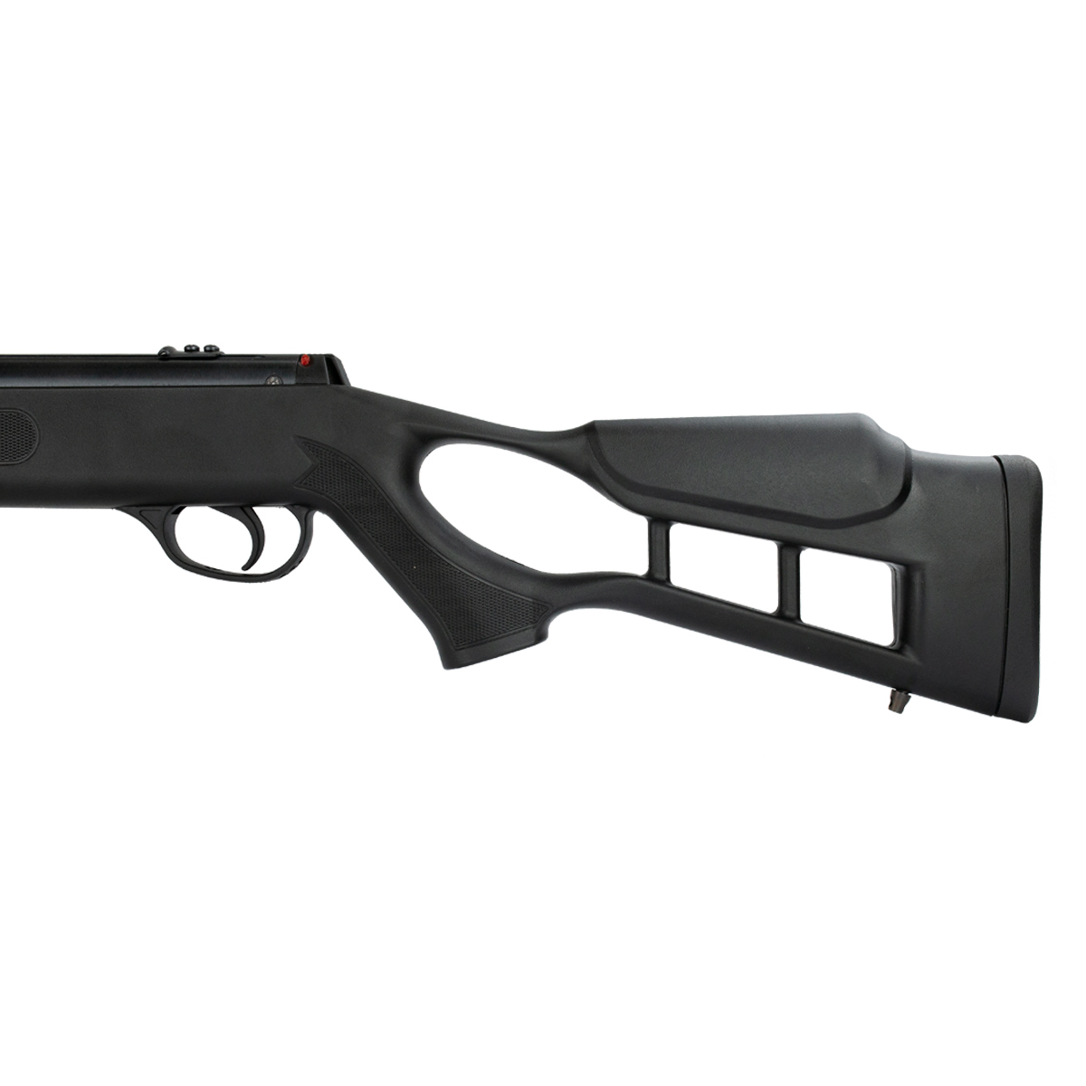 Esta Carabina de Pressão 5.5 possui Coronha Ambidestra estilo tática (design tático) com abertura para encaixe do polegar, possui soleira de borracha para maior conforto do atirador.