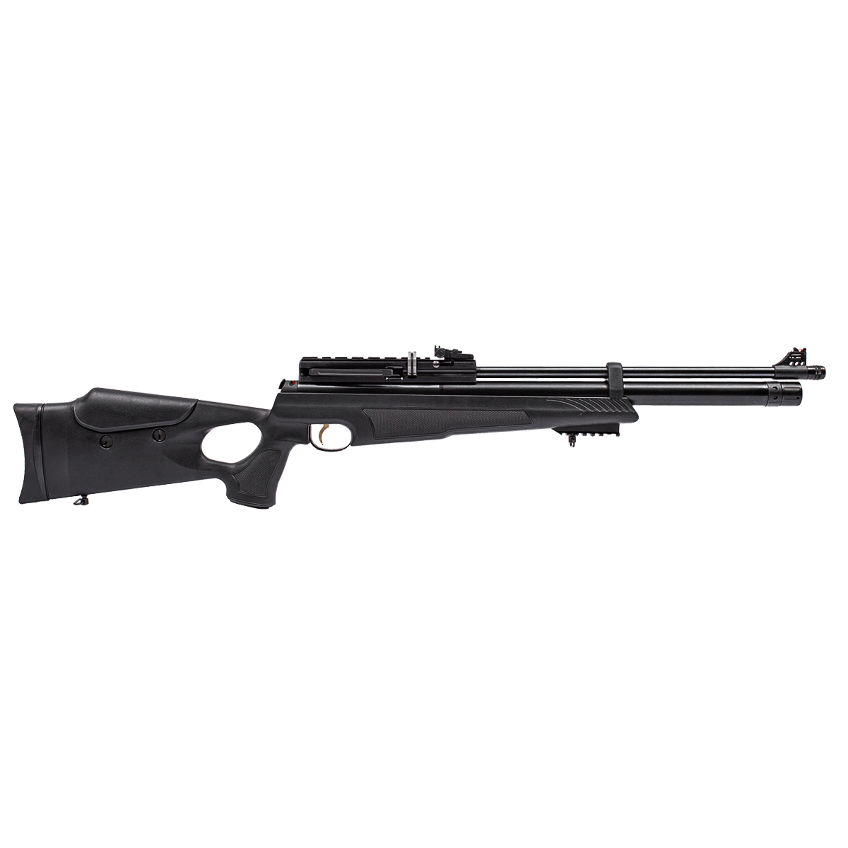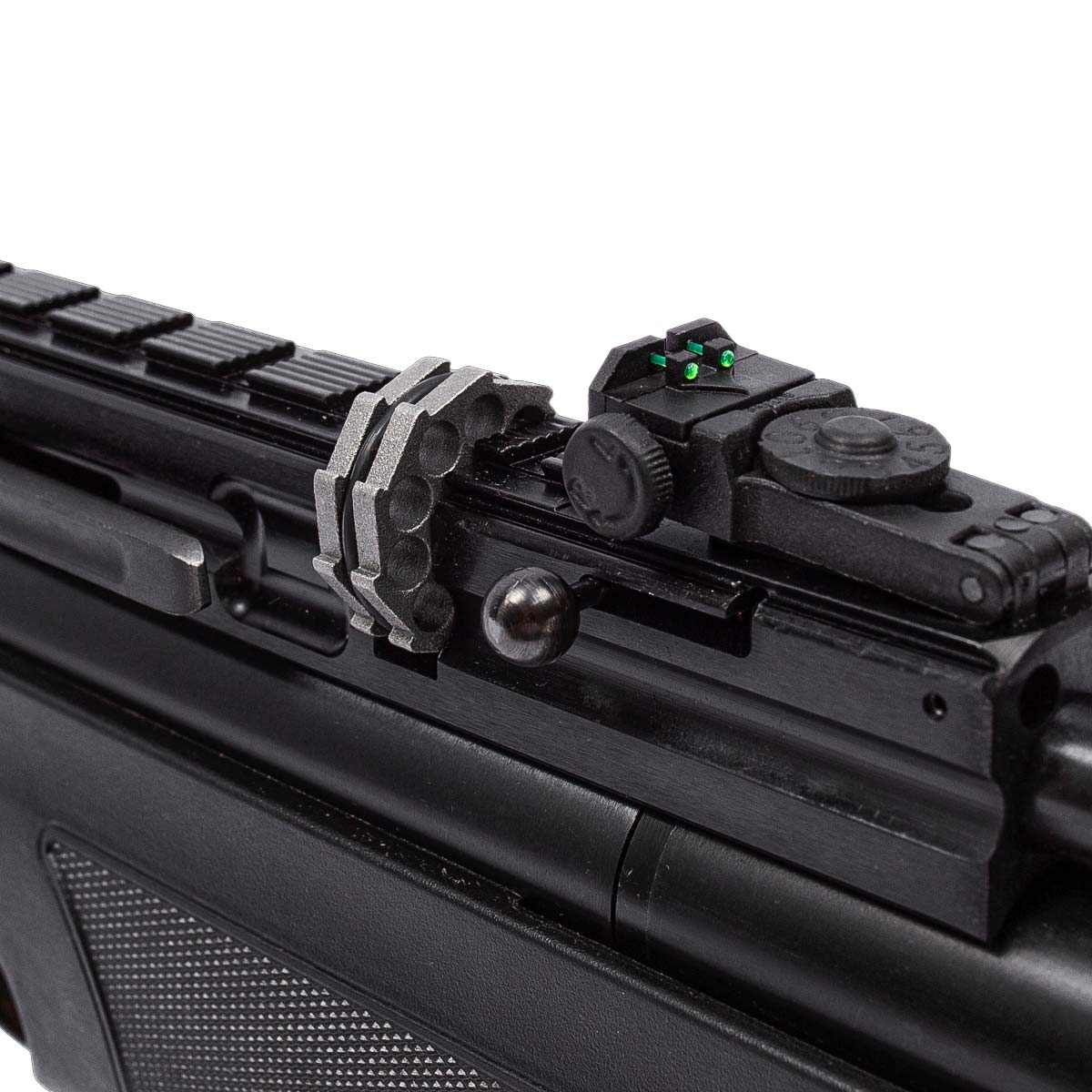Essa PCP Hatsan é uma carabina Multishot com engatilhamento por alavanca lateral (side lever).