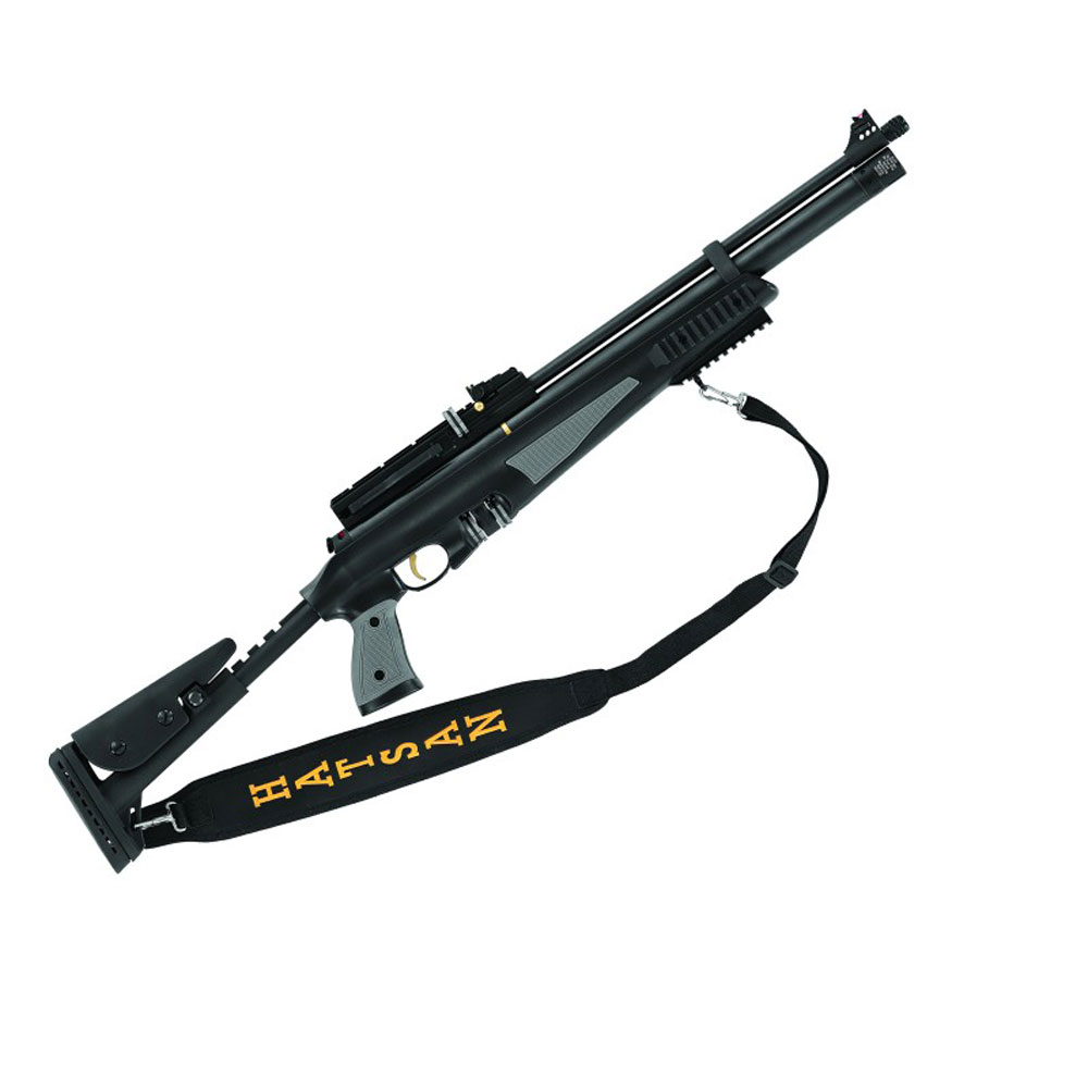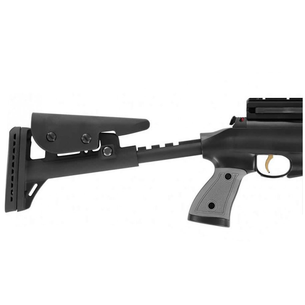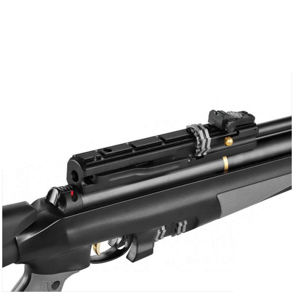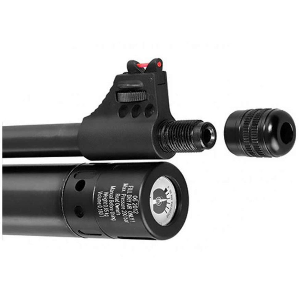 Arma de ação por cilindro de ar pneumático pré-carregado (PCP) com 10 tiros, mecanismo de alimentação que previne o carregamento de mais de um chumbinho no cano.