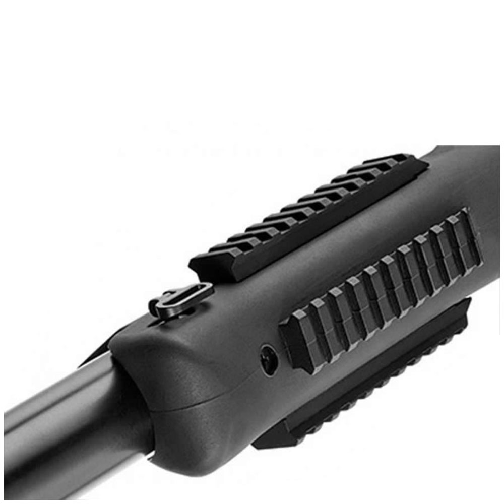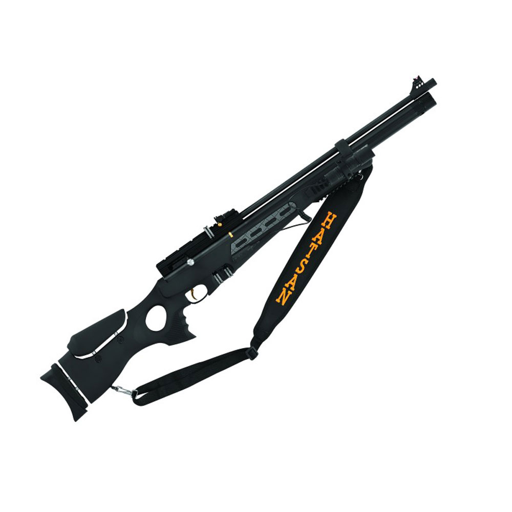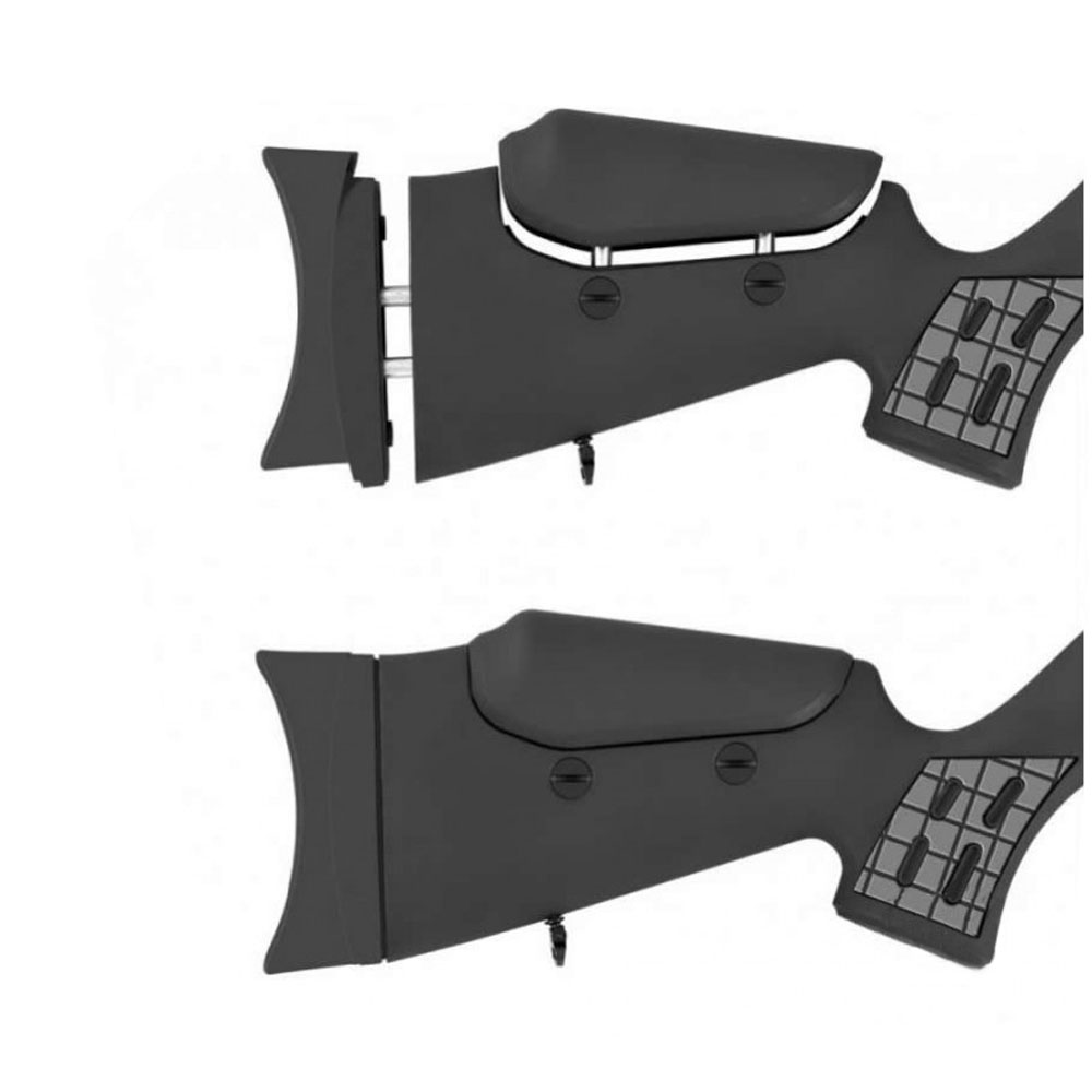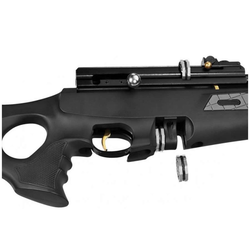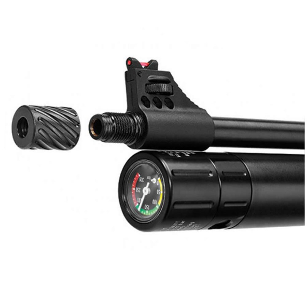 Arma de ação por cilindro de ar pneumático pré-carregado (PCP) com 10 tiros, mecanismo de alimentação que previne o carregamento de mais de um chumbinho no cano.