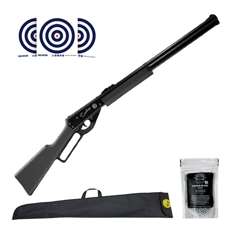 CARABINA LEVER ACTION ROSSI COWBOY PRETA 4.5 MM + CAPA ROSSI 113 CM + ESFERAS 4.5MM LC + ALVOS