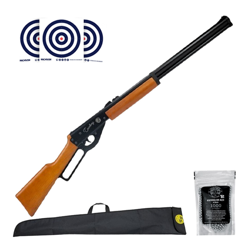 CARABINA LEVER ACTION ROSSI COWBOY 4.5 MM MADEIRA + CAPA ROSSI 113 CM + ESFERAS 4.5MM + ALVOS