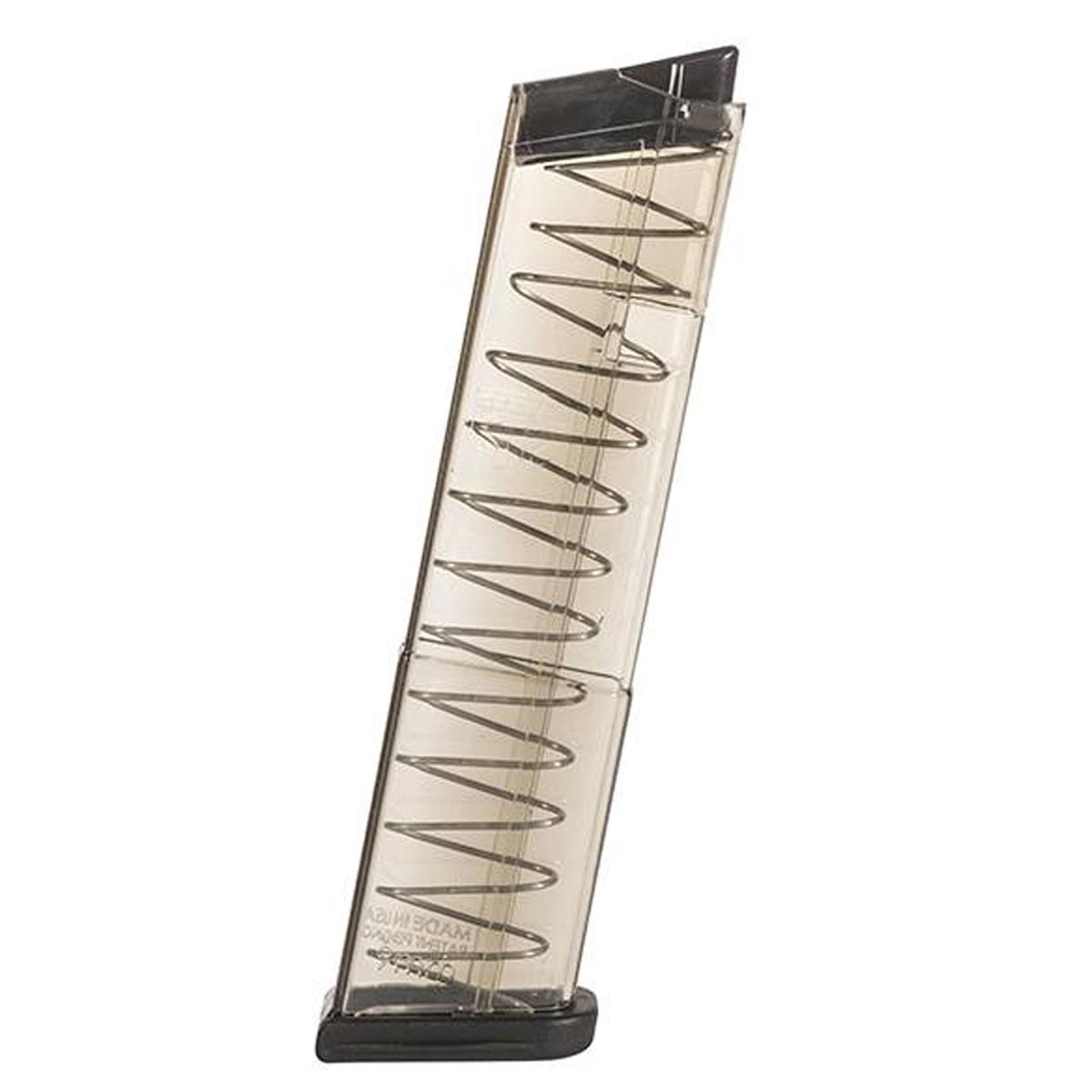 Carregador para pistola Glock calibre 9 mm, fabricado pela ETS (Elite Tactical Systems) em polímero de alta densidade que garante resistência a impactos, evitando danos na queda.