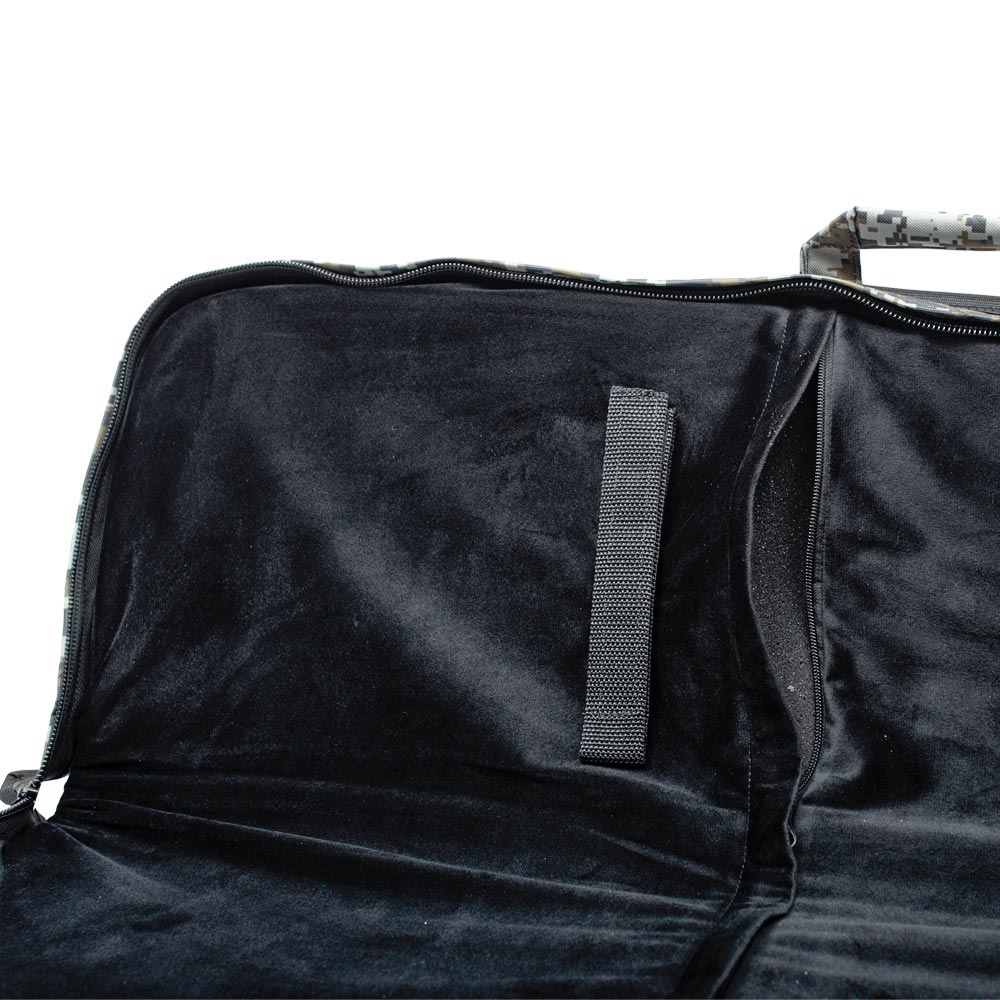 Internamente, duas fitas de velcro ajustáveis asseguram que sua carabina permaneça completamente fixa, eliminando movimentos indesejados que poderiam causar avarias durante o transporte.