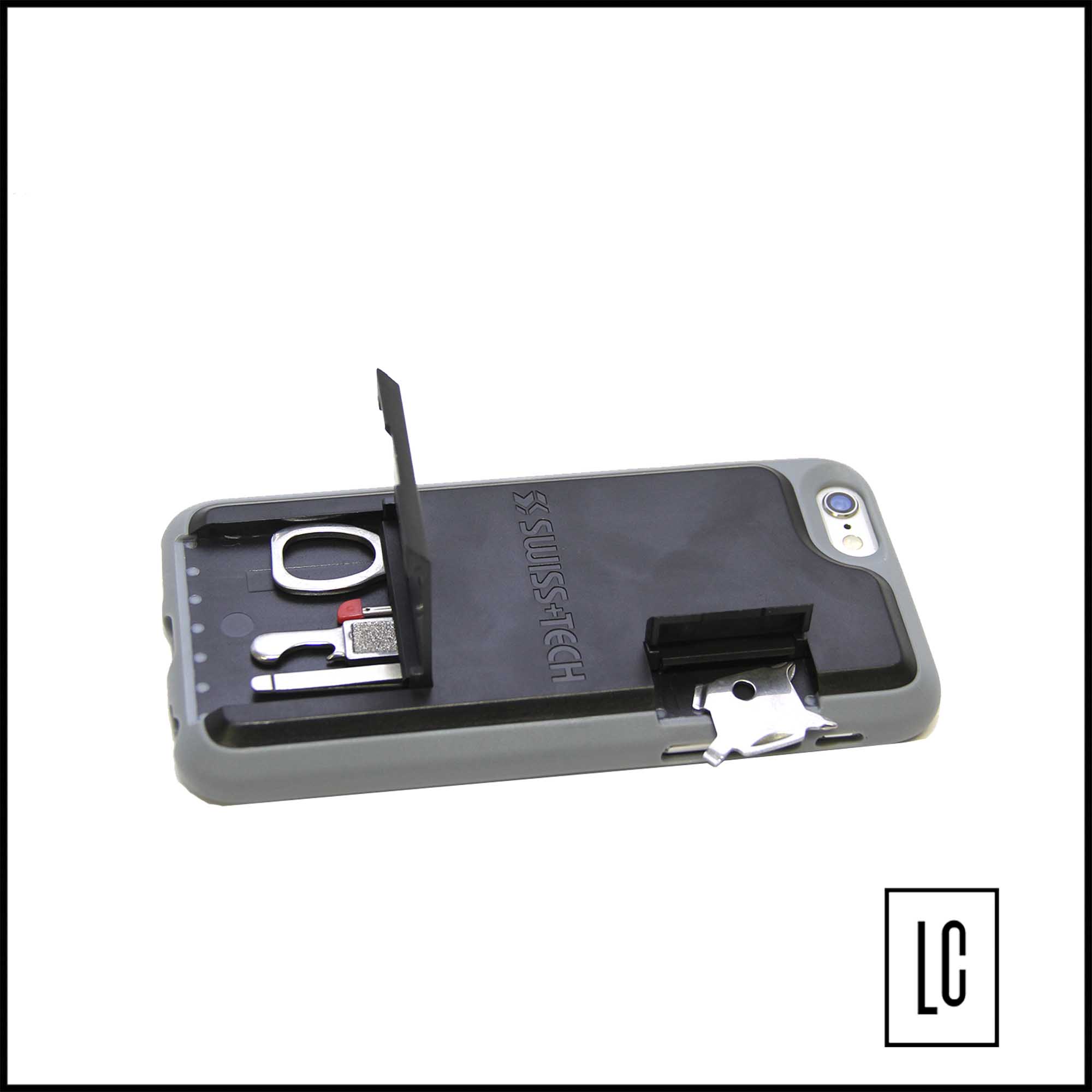 Case de multifunção para Iphone 6. Possui: duas chaves de fenda, duas chaves phillips, tesoura, lixa, limpa unha, tira cuticula, abridor de garrafa, pinça e caneta.