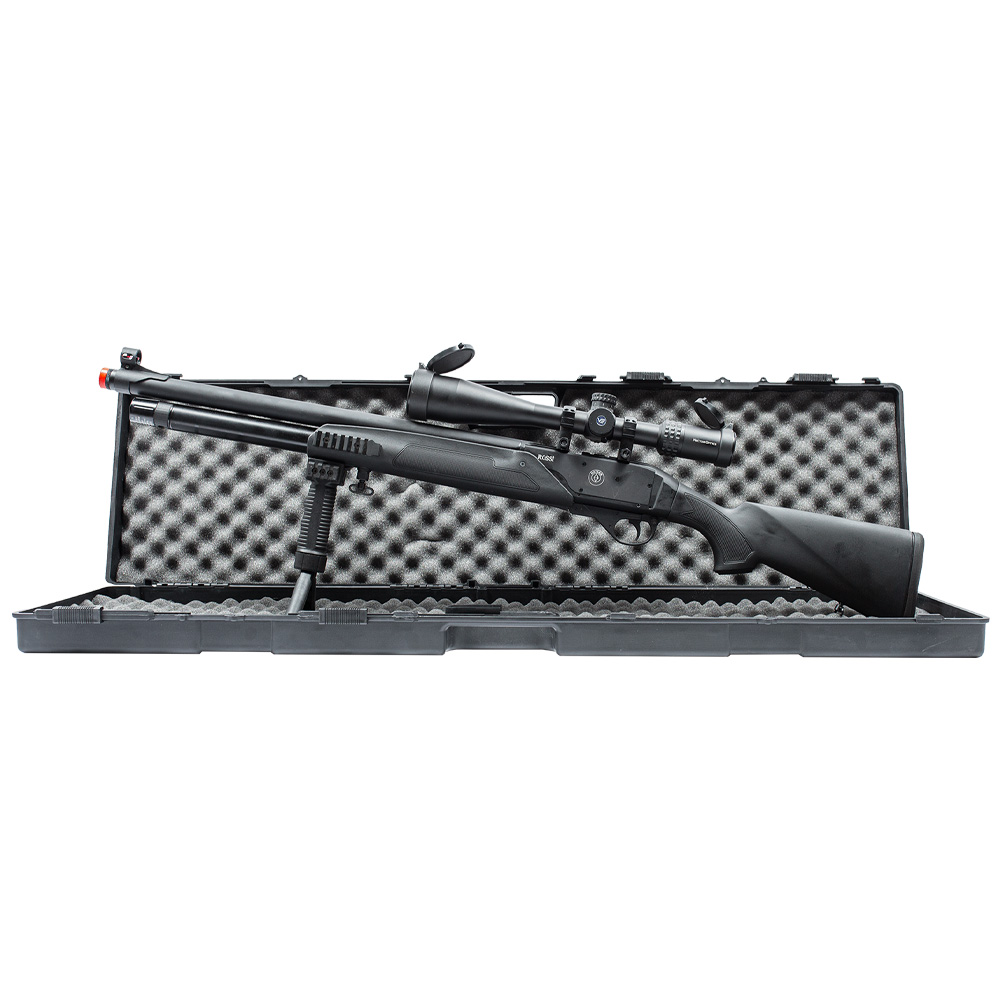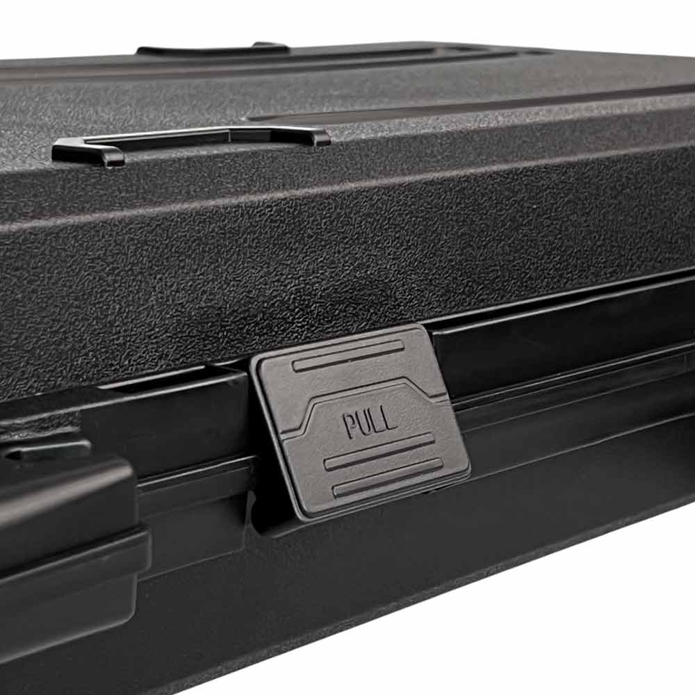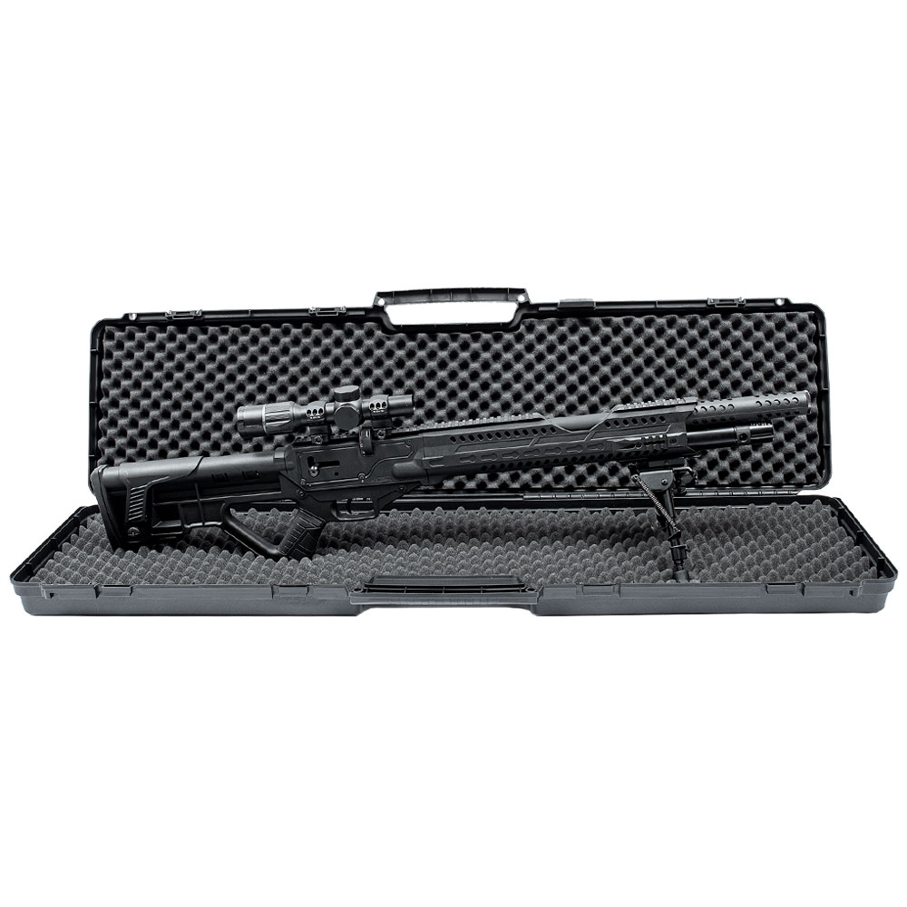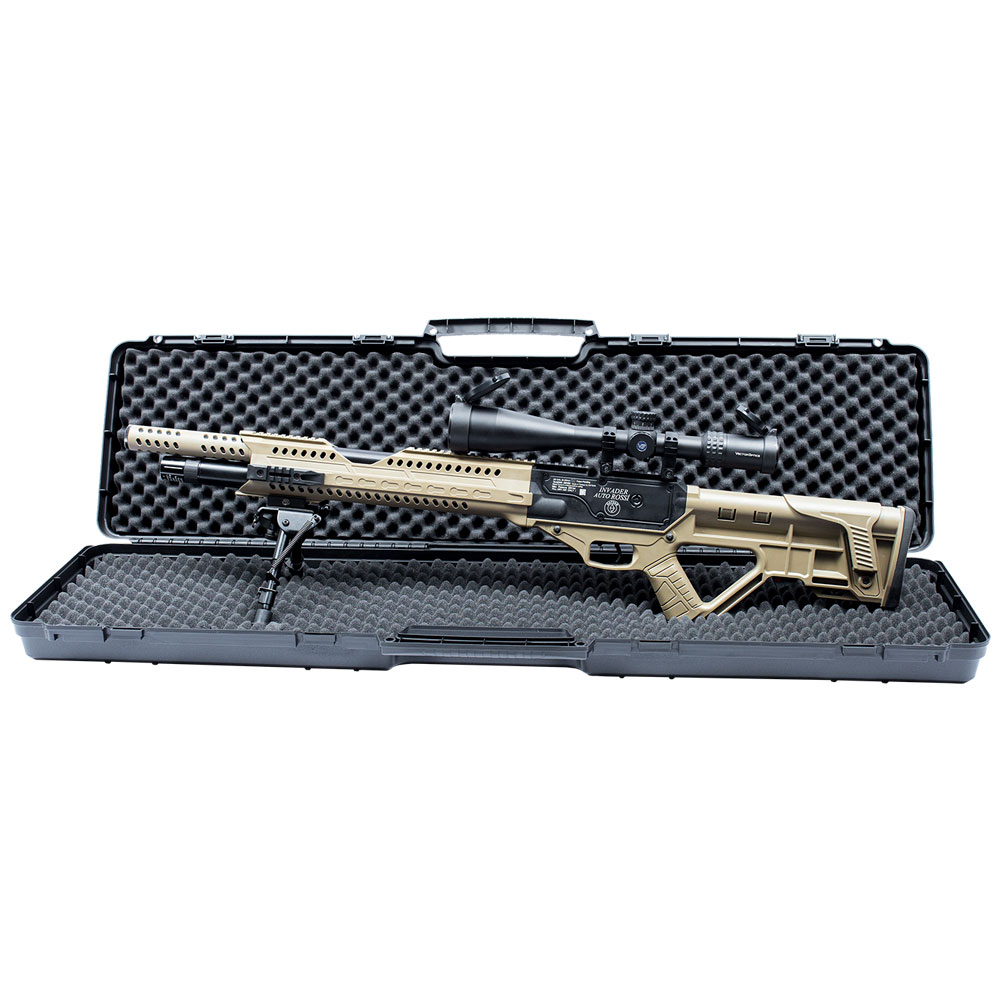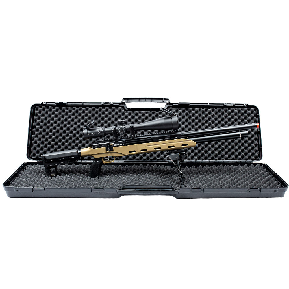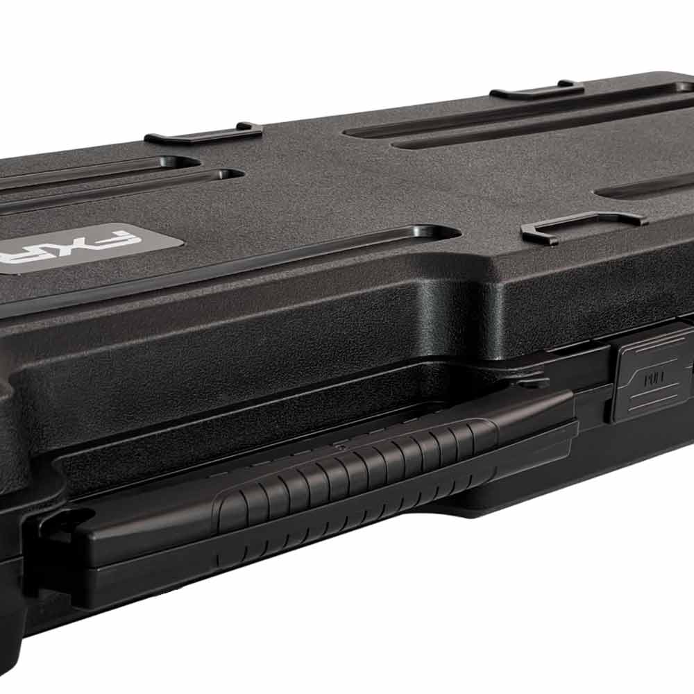 O Case rígido FXR para carabina mede 120 x 30 x 12 cm externamente e 119 x 29 x 10 cm internamente, pesa 3 kg e oferece proteção completa graças à construção em polipropileno moldado ultra durável, espuma interna espessa do tipo caixa de ovo para amortecimento, vedação por O-ring com nível IP65 contra poeira e respingos, quatro travas de alta eficiência, orifícios duplos para cadeado e alça lateral ergonômica para facilitar o transporte, sendo a escolha ideal para quem precisa guardar ou deslocar armas longas com segurança e resistência a impactos.