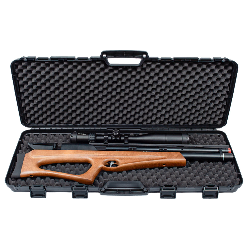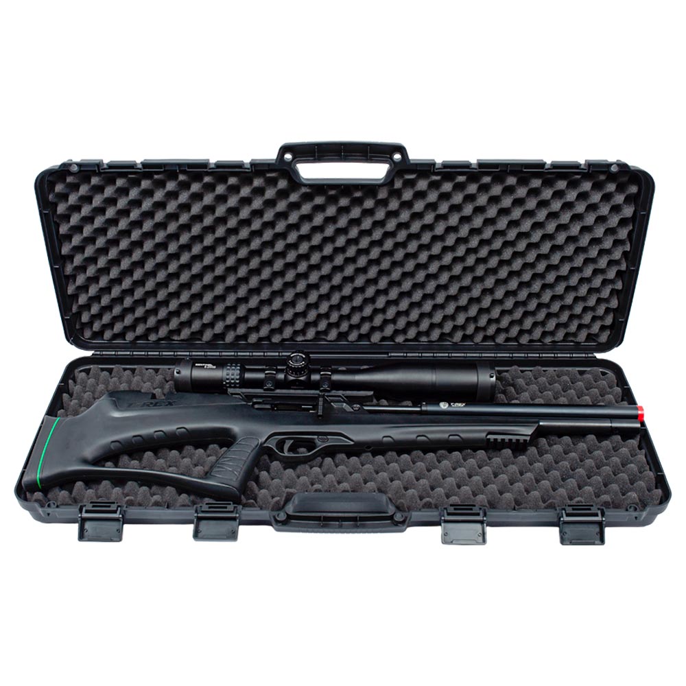 Carabina PCP T-Rex para demontração de encaixe na Case Rígida FXR. Na imagem ela está equipada com uma luneta grande, é a Luneta 6-24X50 FFP Sentinel Vector Optics (Ref.: 10863).