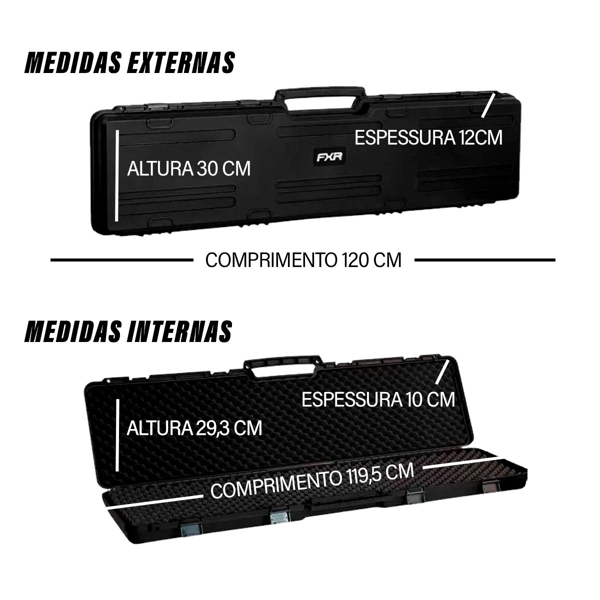 O Case rígido FXR para carabina mede 120 x 30 x 12 cm externamente e 119 x 29 x 10 cm internamente, pesa 3 kg e oferece proteção completa graças à construção em polipropileno moldado ultra durável, espuma interna espessa do tipo caixa de ovo para amortecimento, vedação por O-ring com nível IP65 contra poeira e respingos, quatro travas de alta eficiência, orifícios duplos para cadeado e alça lateral ergonômica para facilitar o transporte, sendo a escolha ideal para quem precisa guardar ou deslocar armas longas com segurança e resistência a impactos.