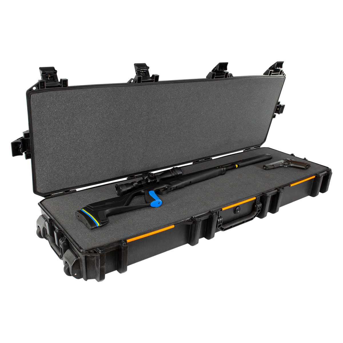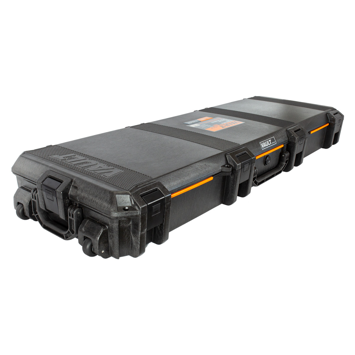 O modelo Vault V800 é um case longo que comporta até 2 rifles com mira de forma segura e com praticidade de transporte, pois além da alça de mão central possui alça de mão nas laterais que permite o transporte utilizando as rodinhas acopladas na case.