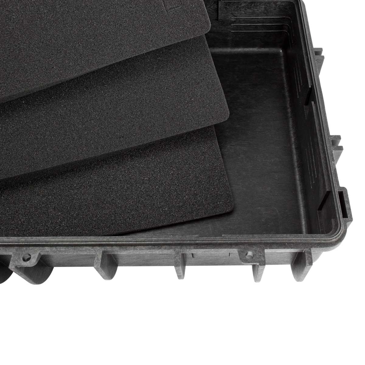 São 4 camadas de espuma. Duas são espumas modulares com espessura de 39mm cada, que você pode formar o desenho de qualquer equipamento que caiba na case e mantê-lo fixo dentro, sem se preocupar com acidentes. As outras duas camadas de espuma se tratam da espuma de cima, tipo bandeja de ovo, e a outra é uma mais fina com 10mm de espessura no fundo da case para garantir a absorção contra impactos dos equipamentos direto contra o fundo da case.
