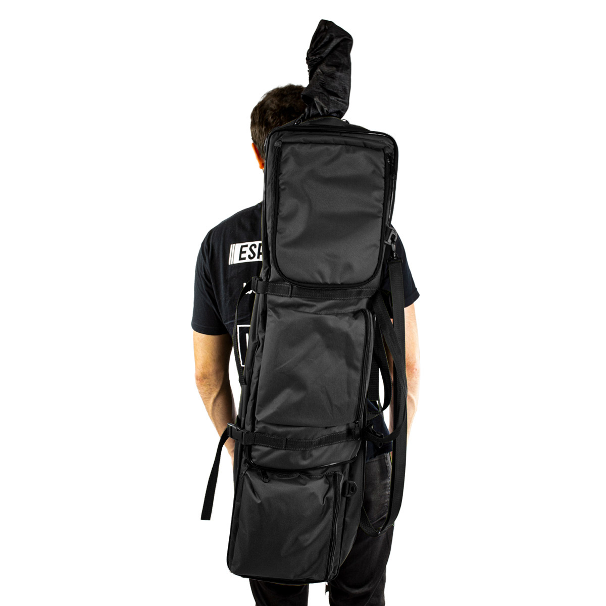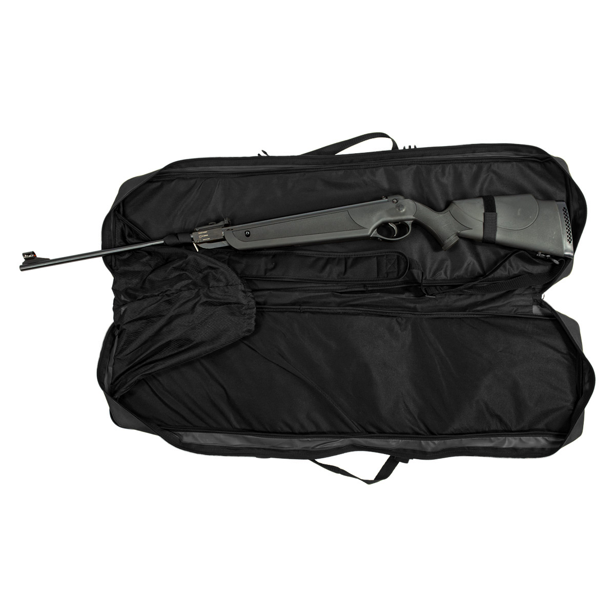 A mochila possui um compartimento adaptável para rifles logos de até 125cm, um compartimento para rifles médios e outro compartimento para pistolas.