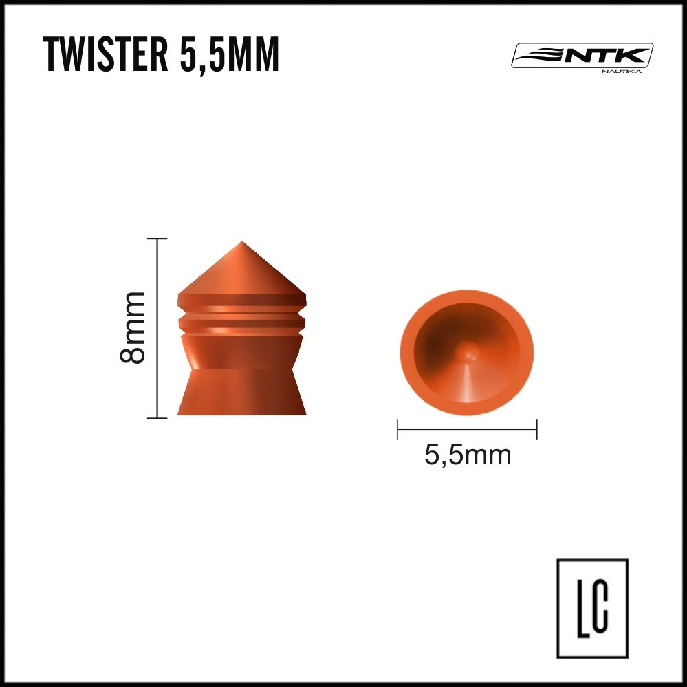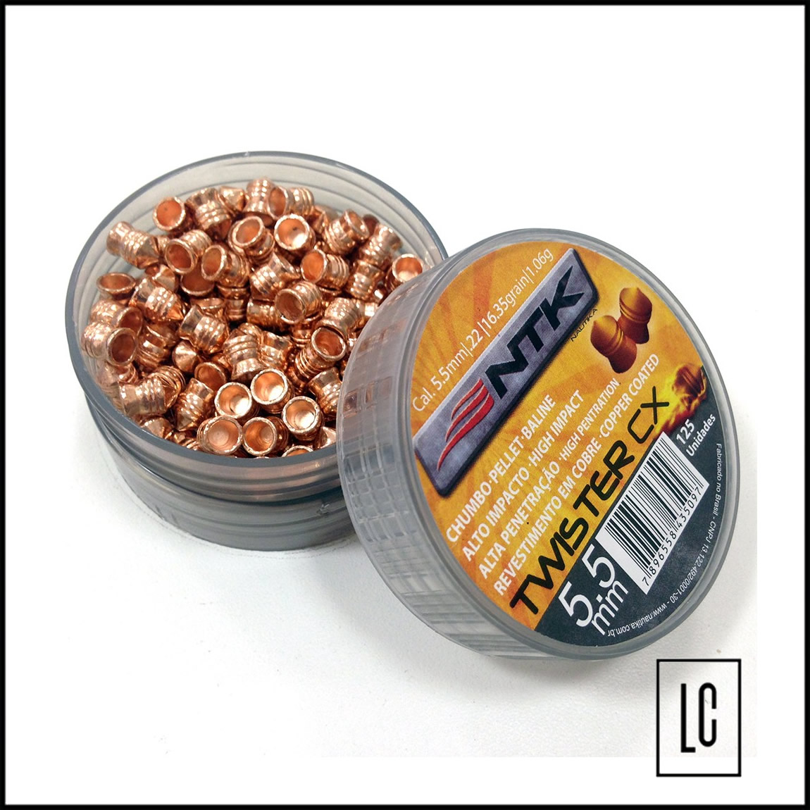 Munição de calibre 5,5mm, o chumbinho Twister tem a aerodinâmica na qual seu corpo foi desenvolvido permite que o tiro obtenha maior penetração no alvo.